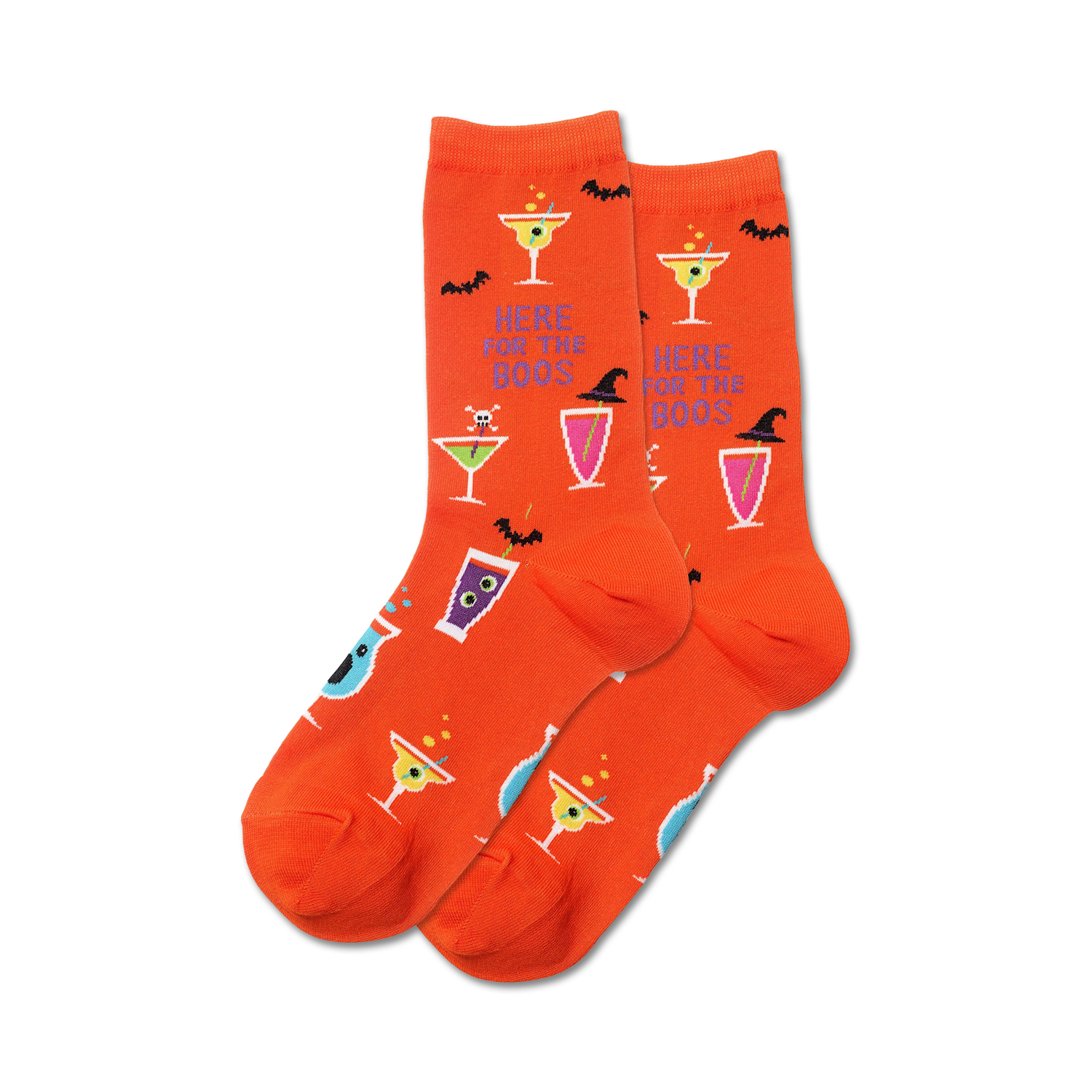 Spooky season just got even spookier with these fun, festive, and frightfully cute Here For The Boos crew socks! Featuring a haunting pattern of black bats, magical martini glasses, and spooky ghosts, these orange socks are perfect for any Halloween party or gathering. Wear them with your favorite costume or as a fun, everyday accessory, and let the good times roll!