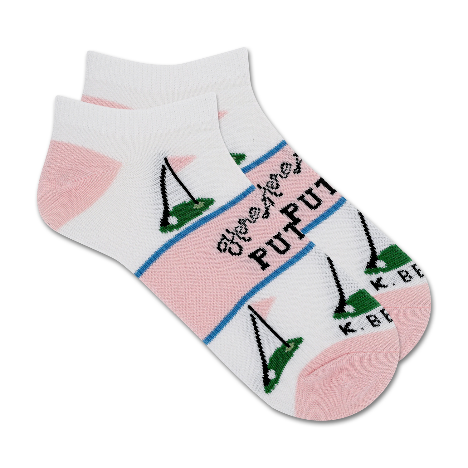 Do you golf? If so, completing your outfit with our stylish 'Here For The Putt' socks is a hole-in-one! Featuring a fun pattern of pink and blue golf clubs and balls on a white background, these ankle-length socks for women are sure to make a splash on the putting green. They'll also keep your feet cozy and dry while you're out making par. And remember, you can't putt if you don't show up. So grab a pair of these socks and get your best round going today!