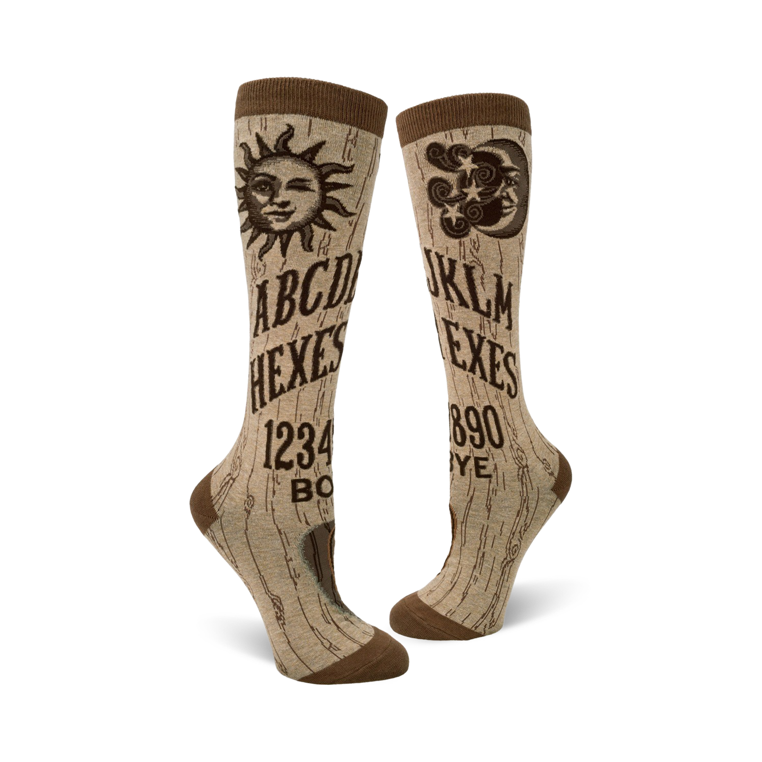 Have you ever played Ouija after a bad breakup? We're guessing you called some real exes. These knee-high, brown Hexes for Exes socks are perfect for the Halloween season. One sock features the letters A-D and 1-4, and the other sock features J-M and 5-9. They also have the words "Hexes" and "Exes" on them, just in case you still have a few more numbers to dial. Curse your exes with this planchette pattern and keep the bad vibes far away.