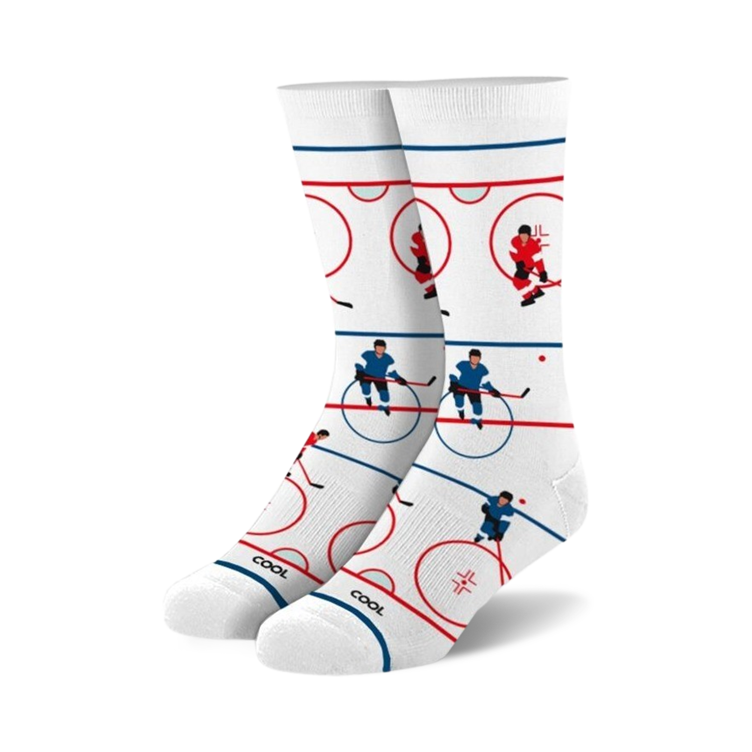 Add a dash of ice into your style with our Hockey-themed socks! These unisex crew socks feature a vibrant blue and red design of hockey players on a rink. Lace up these bad boys and get ready to score style points wherever you go. This design is sure to be a hit with any hockey fan!