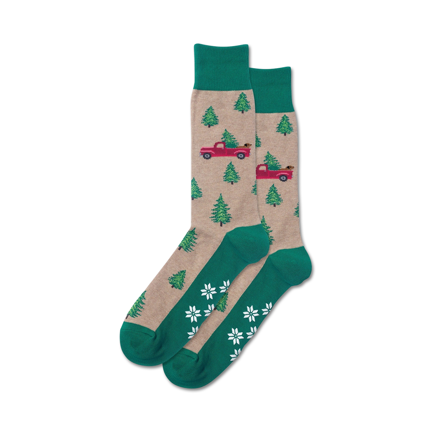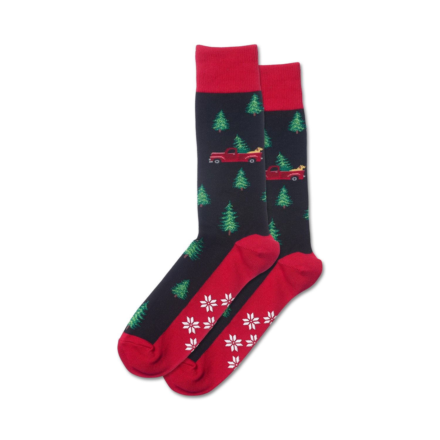 Deck the halls and spread some holiday cheer with our "Holiday Trucks Non-Skid Slipper" Men's Crew Socks! Picture this: dashing red pickup trucks hauling fresh green Christmas trees, all adorned with cute white snowflakes, cruising across the black sock canvas. Who knew Christmas could be so smooth? The red cuffs and toes add a festive touch, while the non-skid grippers on the red soles keep you from slipping and sliding like Santa on a slippery roof. These socks are perfect for spreading holiday joy and warmth, one merry step at a time. Grab a pair and let the Christmas spirit truck you over!