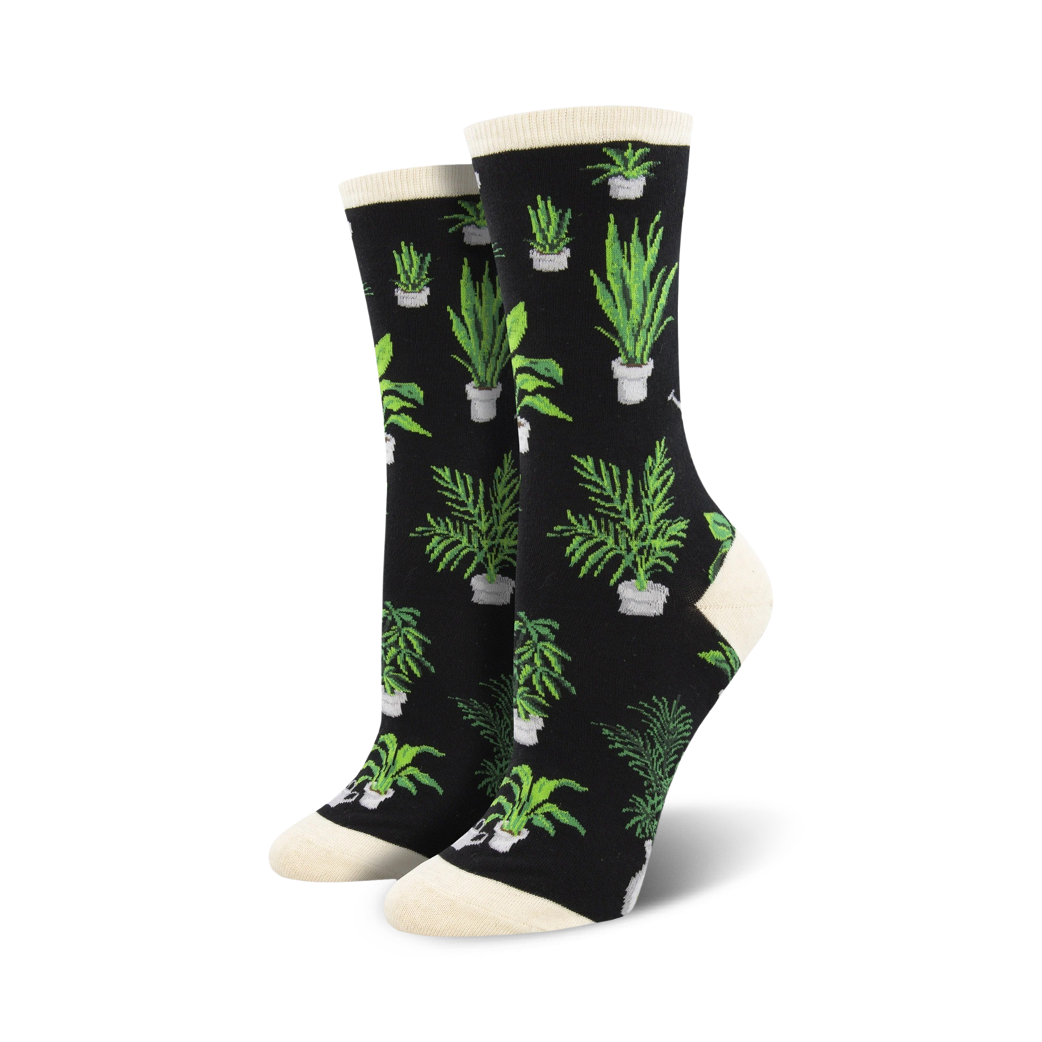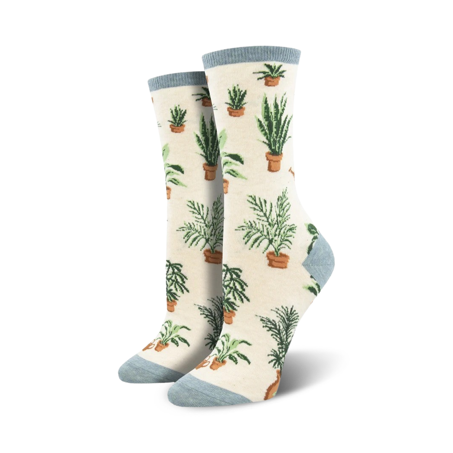 Meet Home Grown, the crew socks that'll add a pop of greenery to your wardrobe and help you keep it real. These off-white socks feature a pattern of potted plants with vibrant green leaves, reminding you that even the smallest things can thrive with a little care. So slip on Home Grown socks and let your feet enjoy the indoors, even when you're out and about.