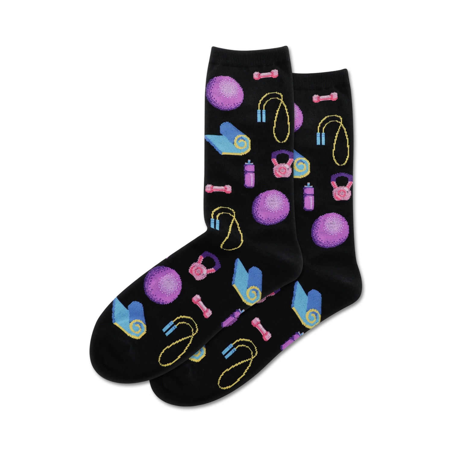 Take your workout style to a whole new level with these Home Workout Crew Socks! Featuring a lively design of workout equipment like yoga mats, jump ropes, dumbbells, water bottles, and exercise balls, these crew-length socks for women will add a dash of fun to your fitness routine. Show off your dedication to a healthy lifestyle with every step you take!