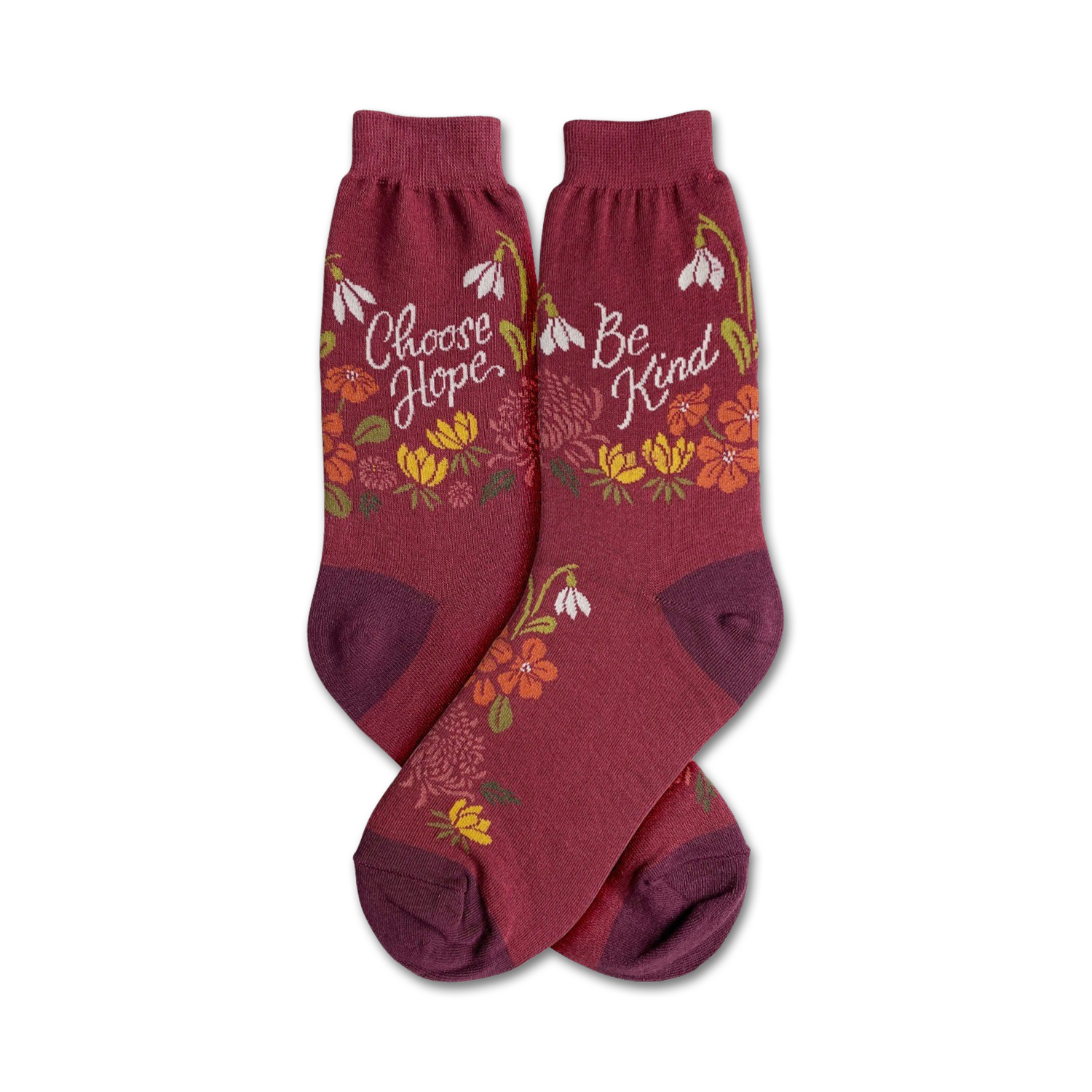 These Hope Floral womens' crew socks are a mesmerizing burgundy and adorned with white blooms. Soft and intricate, they'll cradle your feet as they make their grand debut! From the moment you slip them on, you'll feel as if you're floating on a petal-strewn cloud. And as if that weren't enough, these socks carry a message of hope and kindness ”just what you need to keep your spirits high all day long. So wear them loud and proud, because your feet deserve nothing but the best!