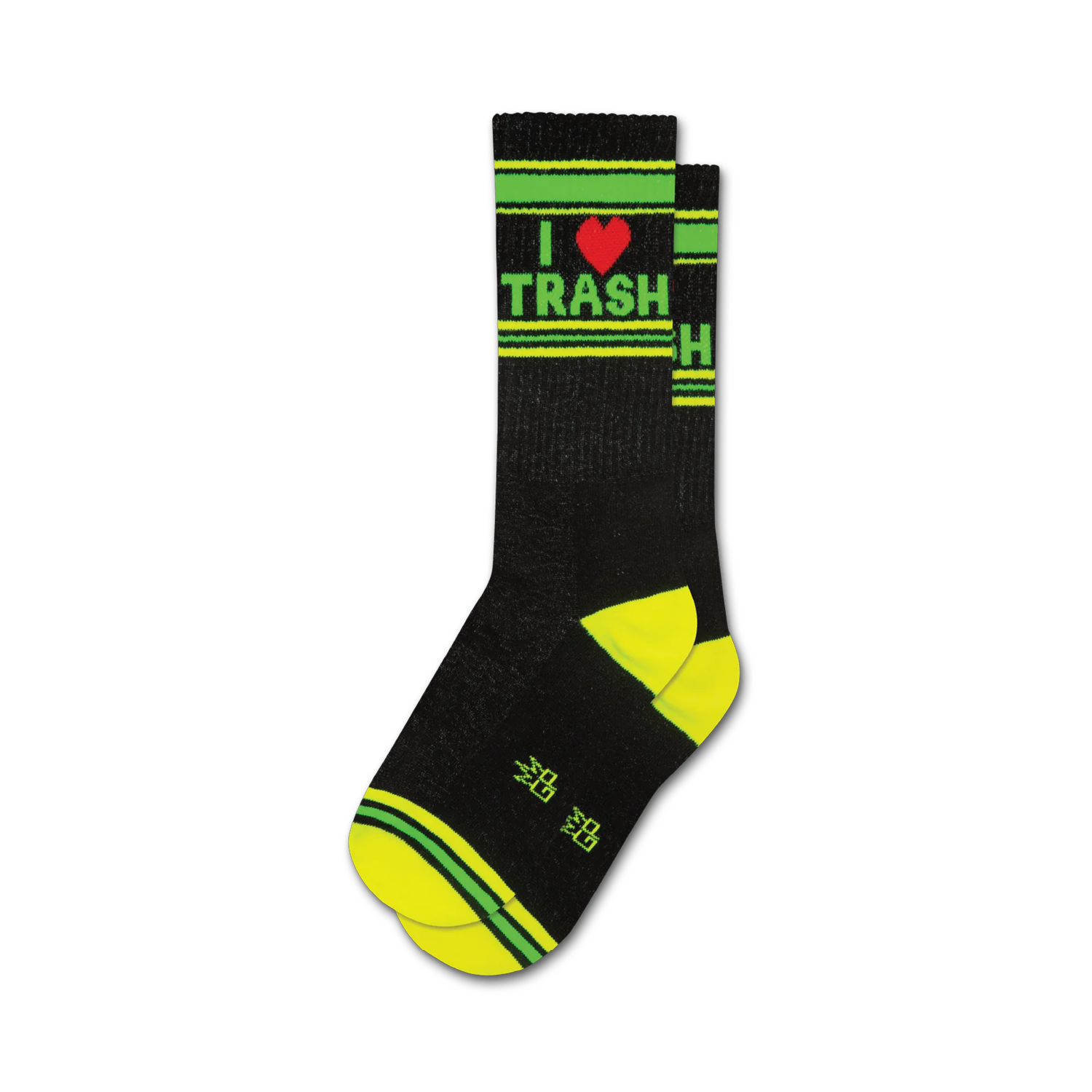 You know what's better than a pair of socks? I <3 Trash socks! These black socks are covered in trash talk. "I Love Trash" is written on the leg, heel, toe, and even the sole! The neon yellow and green highlights make this trash extra sassy!