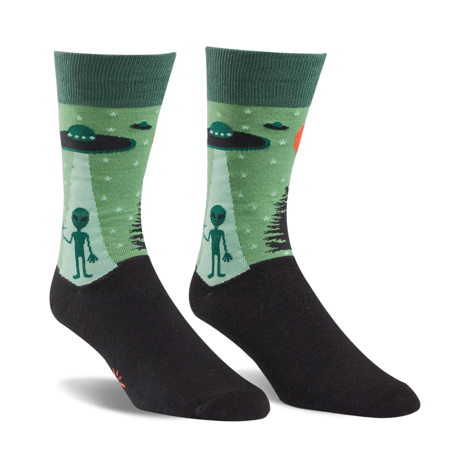 Believe in the extraordinary with these interstellar socks! Journey to the cosmos with each step, surrounded by vibrant aliens and shimmering UFOs against a backdrop of twinkling stars and evergreen trees. These out-of-this-world socks add a touch of intergalactic fun to any outfit and are sure to stir up cosmic conversations wherever you go.
