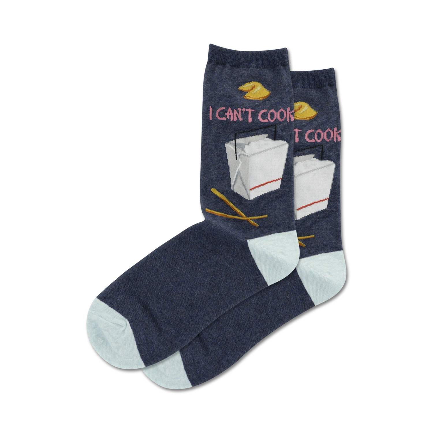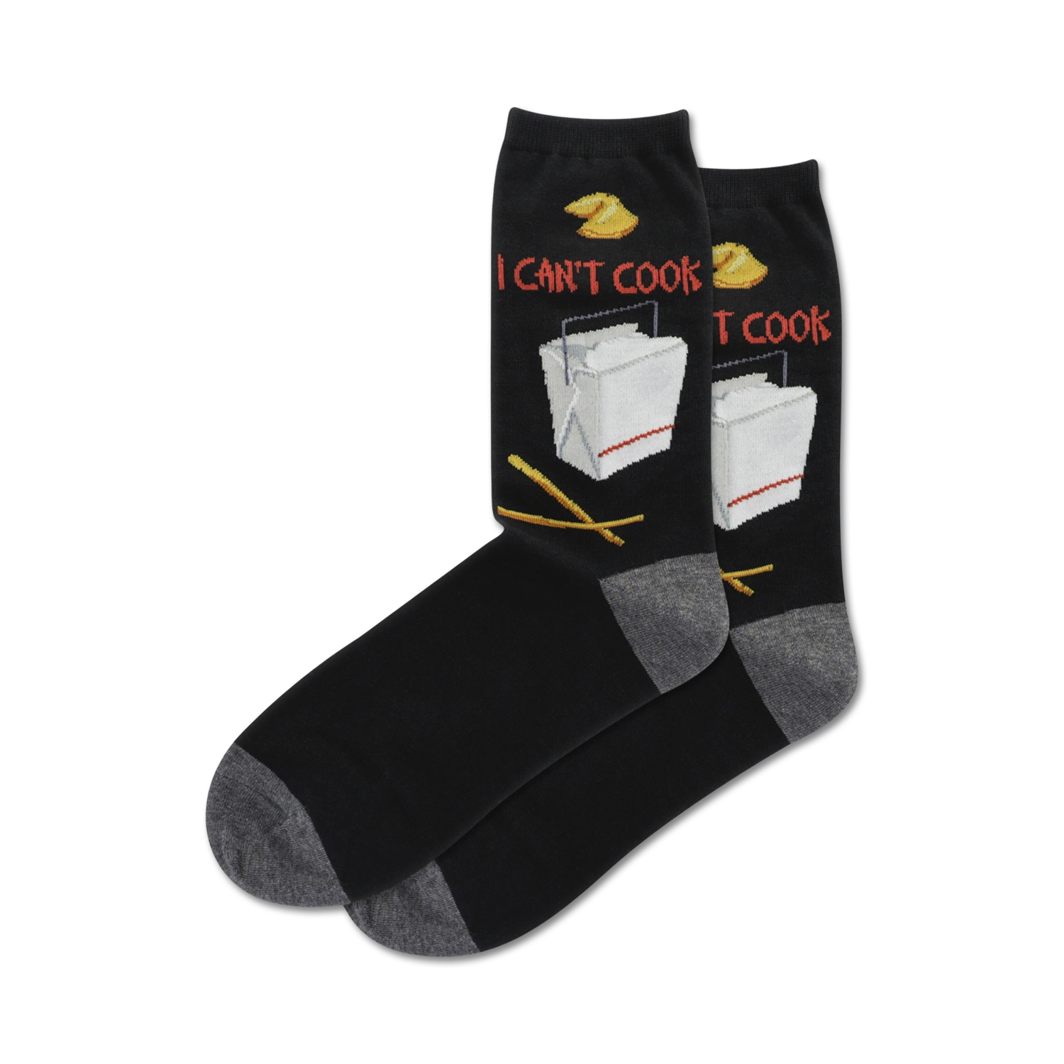 Got the takeout taste without the dreaded chore of cooking? You must be rocking these "I Can't Cook" ankle socks! The grey toes, heels, and cuffs balance out the bold black base, while the yellow lettering and takeout containers with chopsticks add a dash of humor. These socks are perfect for kitchen-challenged foodies, or those who want to pretend they are! Be warned, these socks may cause cravings for your favorite takeout dishes.