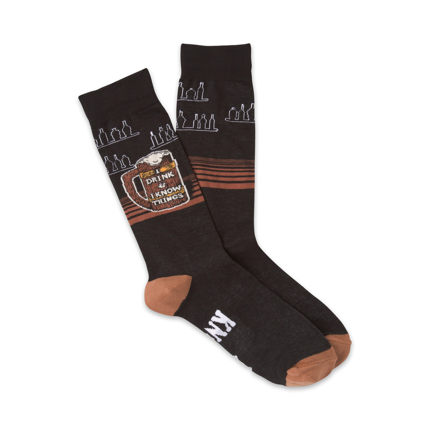 Put a drink in your hand and suddenly, your a contestant on Jeopardy! Who cares if your friends don't understand what you're saying through your slurred speach - you know you're right...at least in this moment you think you do. This pair of funny socks will have your friends ordering you pints and coming to you for all the answers. Each black and pink sock features a beer mug that reads "I drink & I know things" sitting atop the bar.