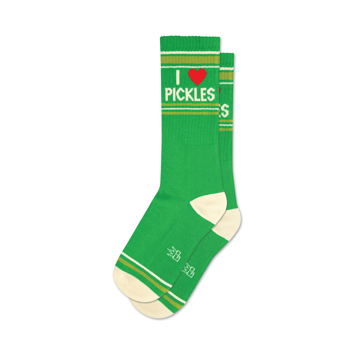 Love those pickles! These I Heart Pickles socks give you a dilly of a good time. Topped with bright green with white accents and featuring a fresh red heart with 'I Heart Pickles' written above, you'll never dill-iver these socks. Show your love for this crunchy snack and pickle lovers will relish the humor. Wear your sole-food with pride!