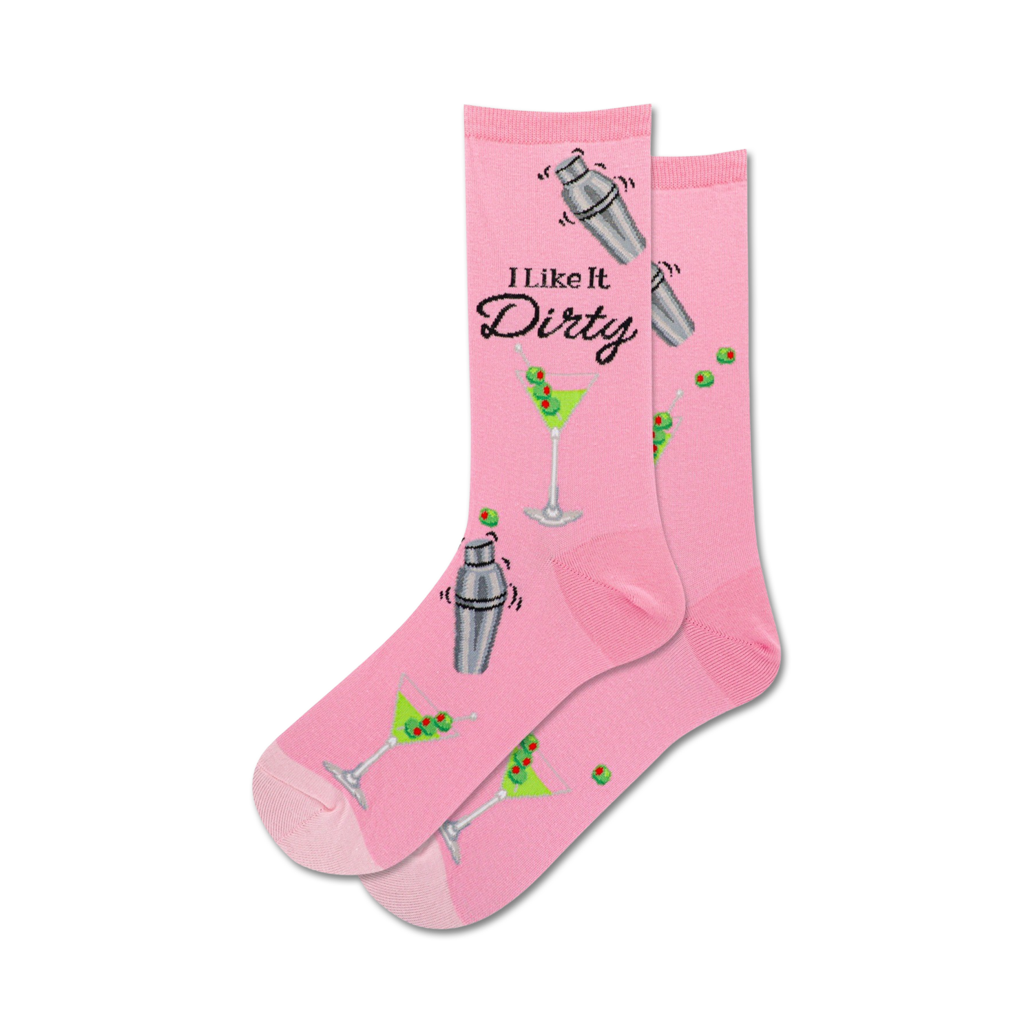 I Like It Dirty Martini Crew Socks - Sip your way to style with these fabulous pink martini socks featuring martini glasses with olives and cocktail shakers. These fun socks are the perfect accessory for the sophisticated socialite who likes to indulge in a little fun. Show off your love for classic cocktails and turn heads wherever you go.