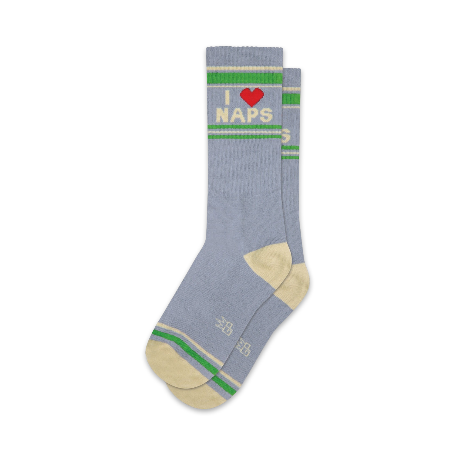 Show off your passion for power naps with these bright blue, green and red socks with the words "I Love Naps" covering them from top to bottom. Dedicated to the art of snoozing, these socks are like tiny love letters to your favorite sleeping position. Since hearts and naps go hand in hand, we added some as a bonus. Grab a pair today and show the world that catching Zs is your favorite activity.