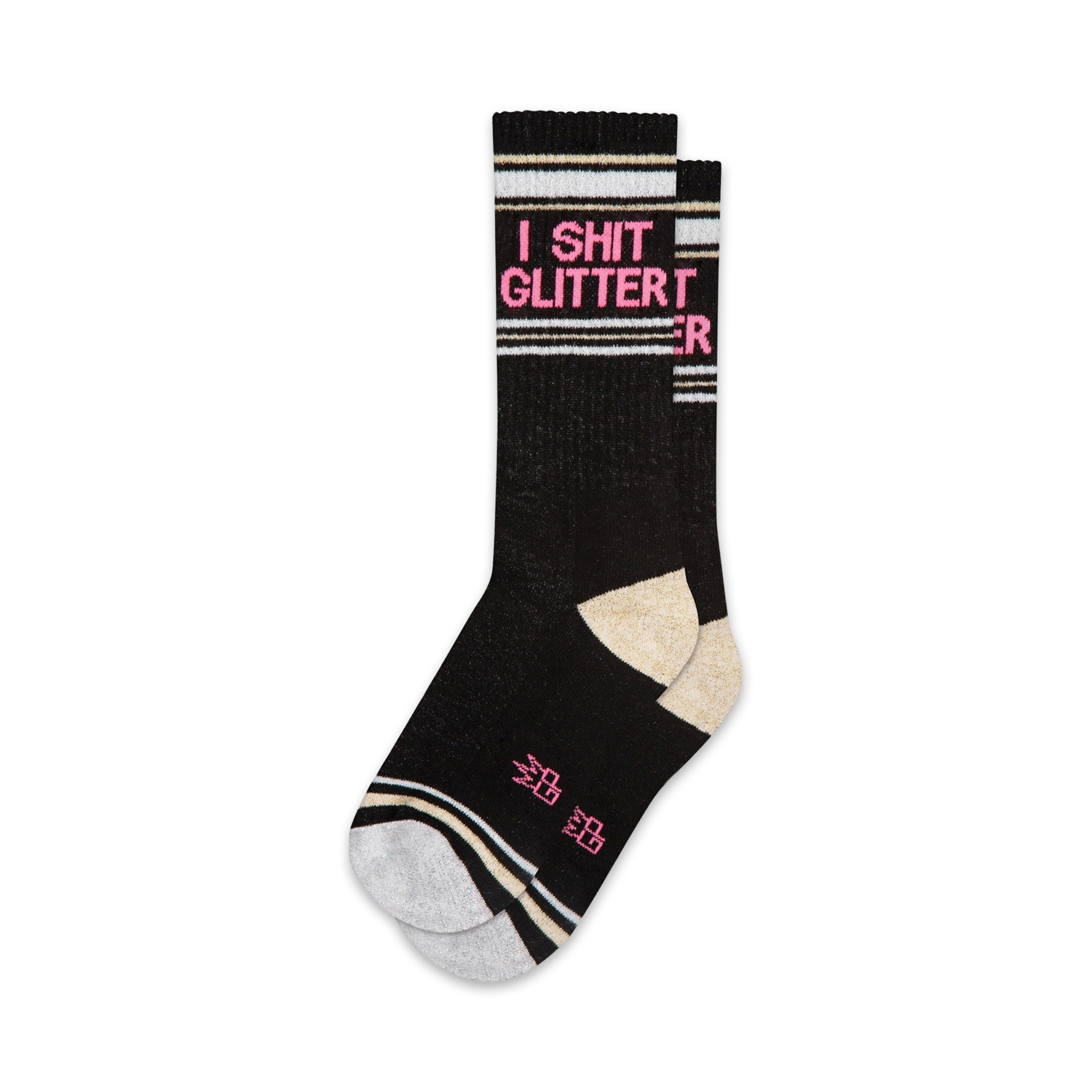 The "I Shit Glitter" socks are the ultimate accessory for anyone who wants to add a touch of fun and humor to their wardrobe. These crew-length socks feature vibrant pink and blue stripes at the top, with white toes and heels. The bold "I Shit Glitter" message, written in sparkly pink letters, is sure to turn heads and make a statement wherever you go. But these socks aren't just about the glitter - they're also incredibly comfortable and made with the highest quality materials. Whether you're rocking them at a party, a festival, or just around the house, these socks are guaranteed to bring a smile to your face and those around you. Put on a pair of "I Shit Glitter" socks and let your inner fabulous shine through!
