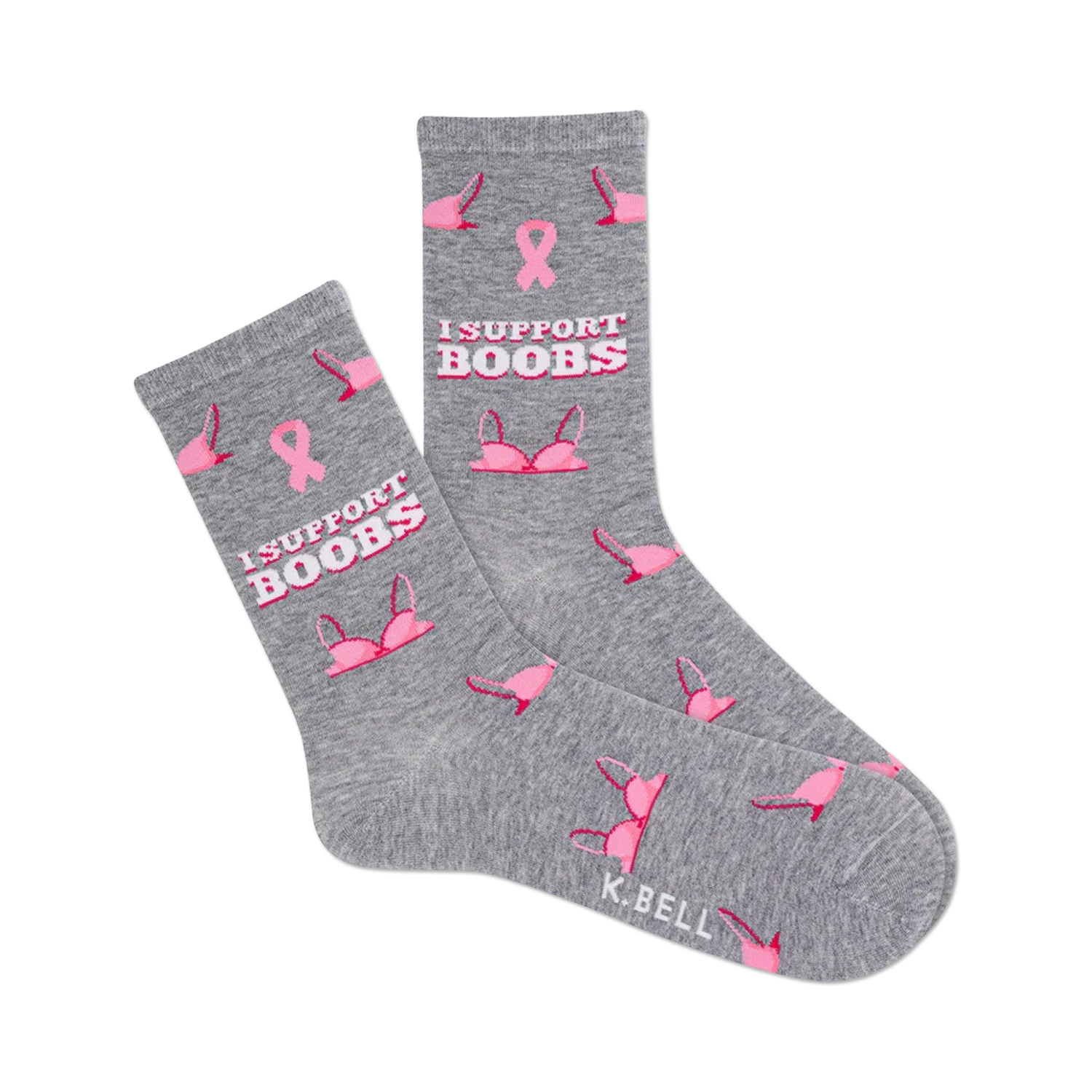 In a world where good vibes and fun reign supreme, let us present you with the ultimate cure for dull feet our I Support Boobs socks! Picture this: a fierce shade of gray adorned with a bold pink ribbon, emblazoned with the message that sparks joy and support, "I SUPPORT BOOBS." And just for kicks, we've added a few cheeky pink bras, just to remind you that life's too short to take fashion too seriously. Join the supportive movement, one foot at a time, with our boob-loving socks that'll make a statement and lift spirits wherever you go!