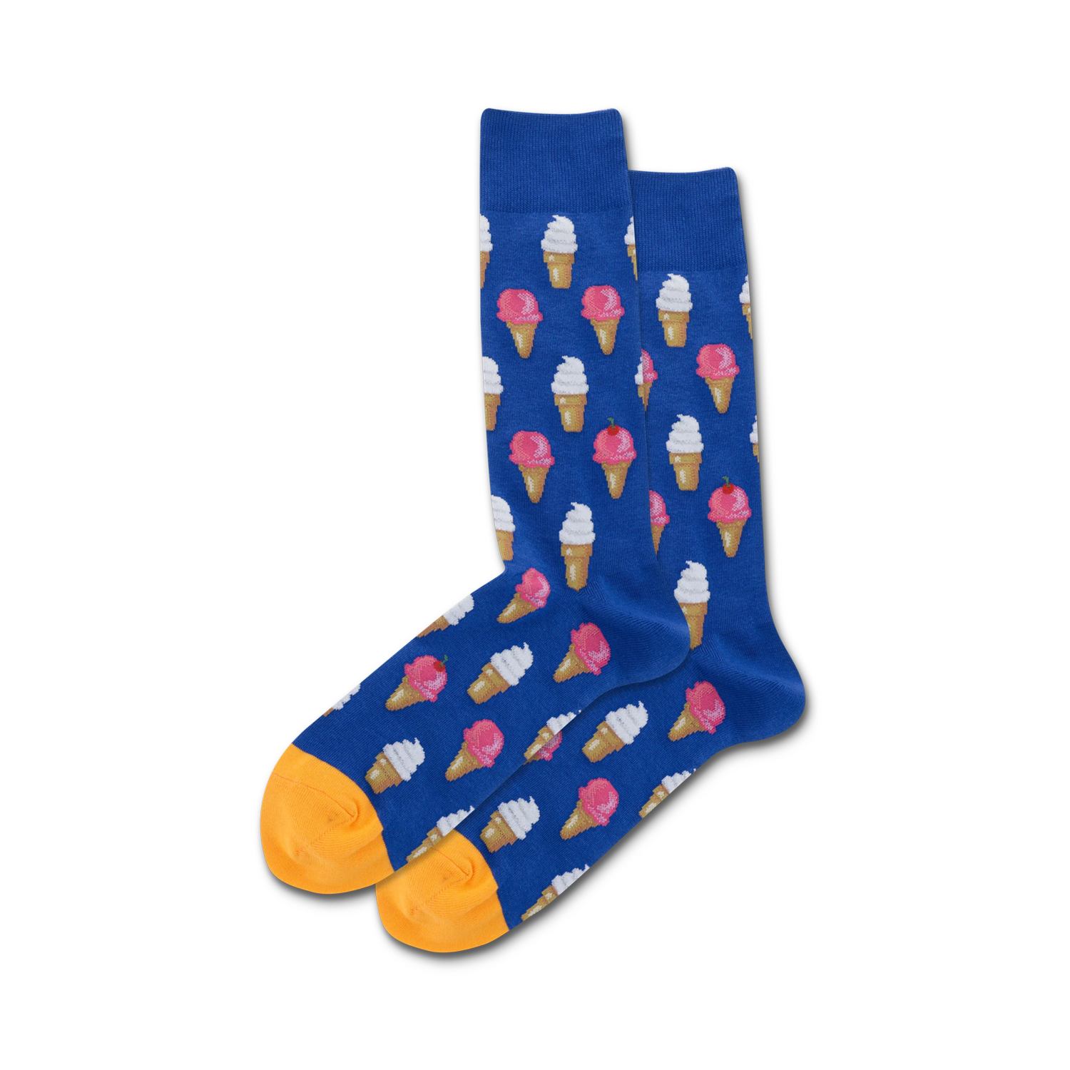 Need a SERIOUSLY COOL way to beat the HEAT this Summer? Ice Cream to the rescue! These gray, ice cream cone-patterned socks have more FLAVOR than popsicles on the 4th of July! With cones & frosting in brown and white and toes in BLUE, these crazy kicks are a sweet treat for your feet!