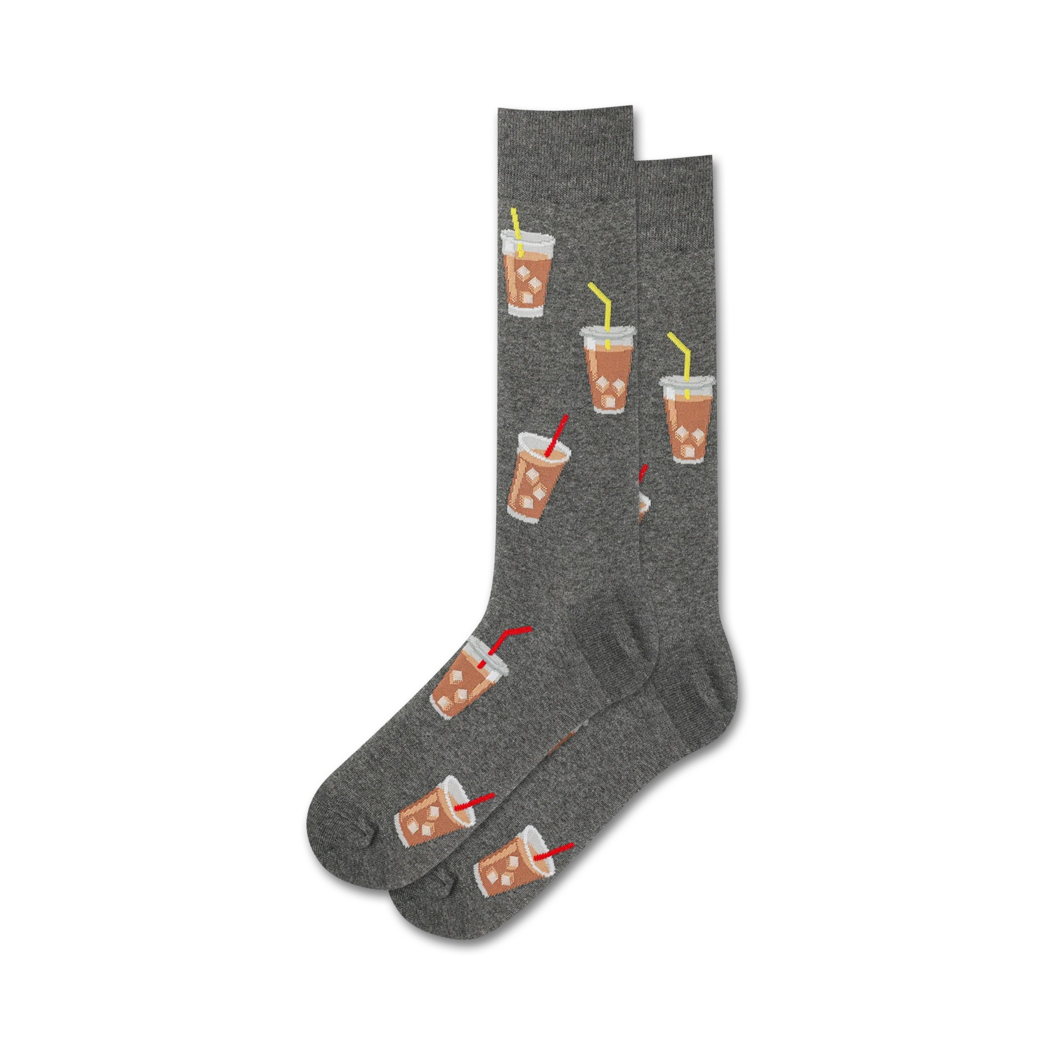 A refreshing pattern of iced coffee drinks covers these grey crew socks. Each clear cup visible on this side holds a light brown beverage with white ice cubes inside. You'll spot some cups with bright yellow straws and others with bold red straws, adding a nice pop of color against the charcoal background. They're a perfect pick for anyone who loves a good cold brew, or just wants to add a cool, casual vibe to their daily look. Imagine wearing these while grabbing your favorite pick-me-up. They're a fun way to show off your laid-back style.
