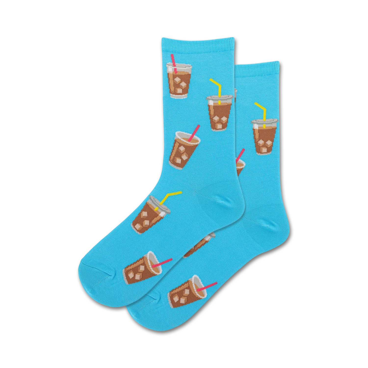 These 'Iced Coffee' socks are pretty much exactly what they sound like: comfy crew socks with a fun iced coffee cup pattern. The main image shows a grey pair, but there's also a light blue version. The visible iced coffee cups have pink straws and brown coffee-looking stuff inside. They're a simple pattern, but they're cheerful. Perfect for your next coffee run or any day you need a little extra caffeine kick in your step.