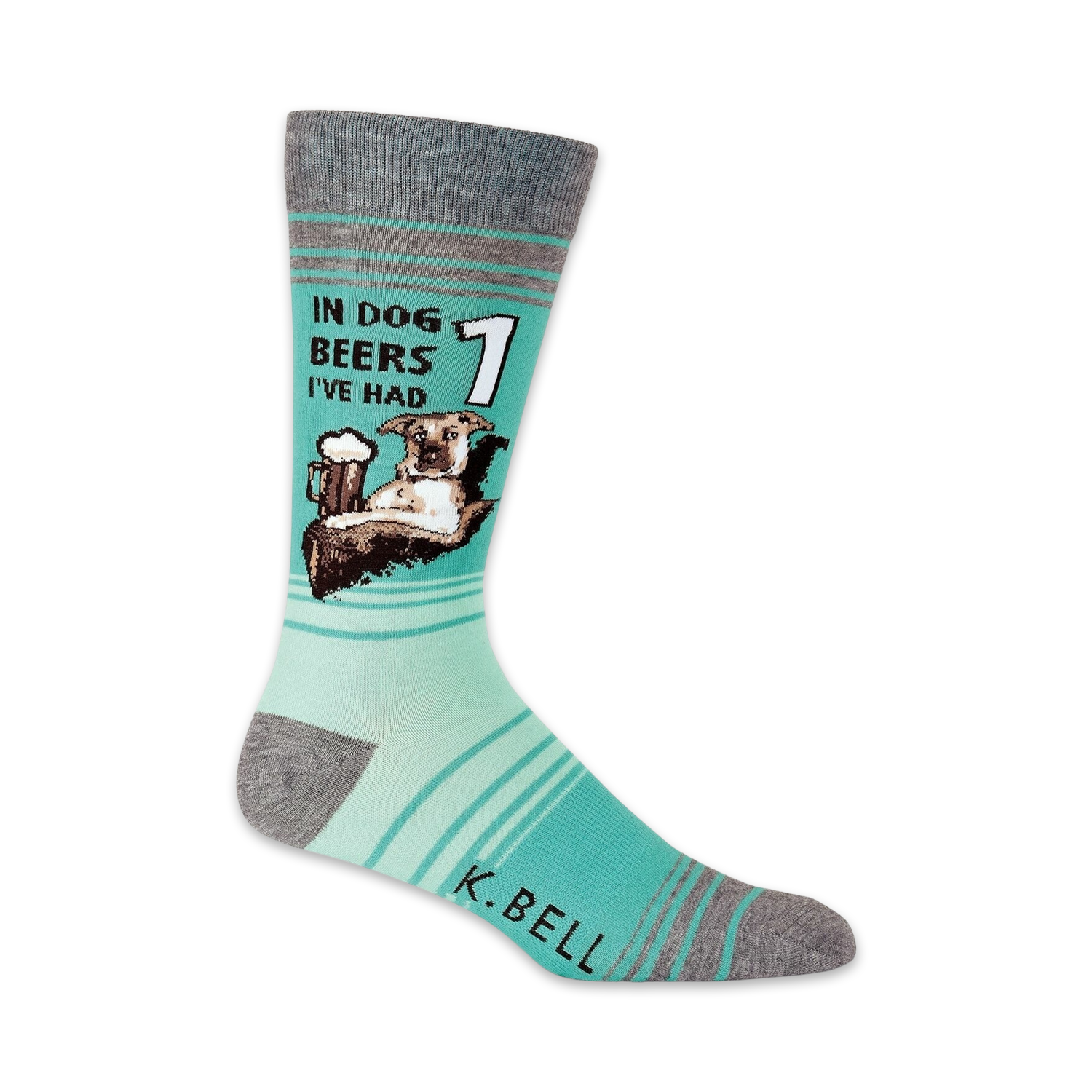 Everyone always confuses dog years with human years. All we know is that less means more when it comes to a man's best friend! These funny socks feature a graphic dog enjoying a nice cold brew. Above him reads "In dog beers I've had 1". These cool socks make a wonderful edition to any beer lover's sock collection.