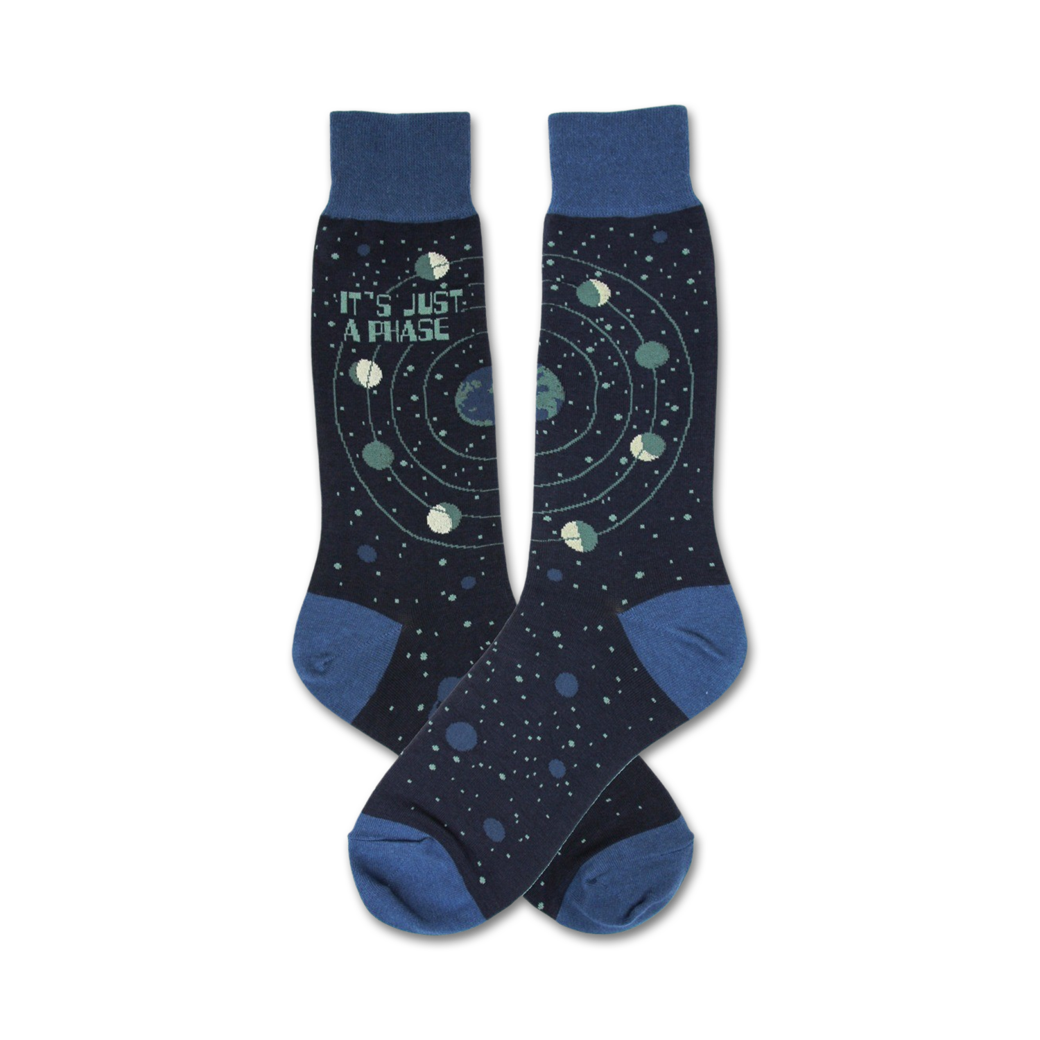 Blast off into the cosmos with this pair of out-of-this-world socks! Featuring the solar system in all its celestial glory, complete with Pluto (yes, we still love it), and a smattering of moons. Don these stellar socks, grab your favorite space jam, and let your feet voyage among the stars. Who said astronomy couldn't be fun? Plus, with the words 'It's Just A Phase' emblazoned across the toes, you'll make everyone moon over your lunar-cy! Your feet will thank you, the Earth will thank you, and even Pluto will be sending you love from the Kuiper Belt.