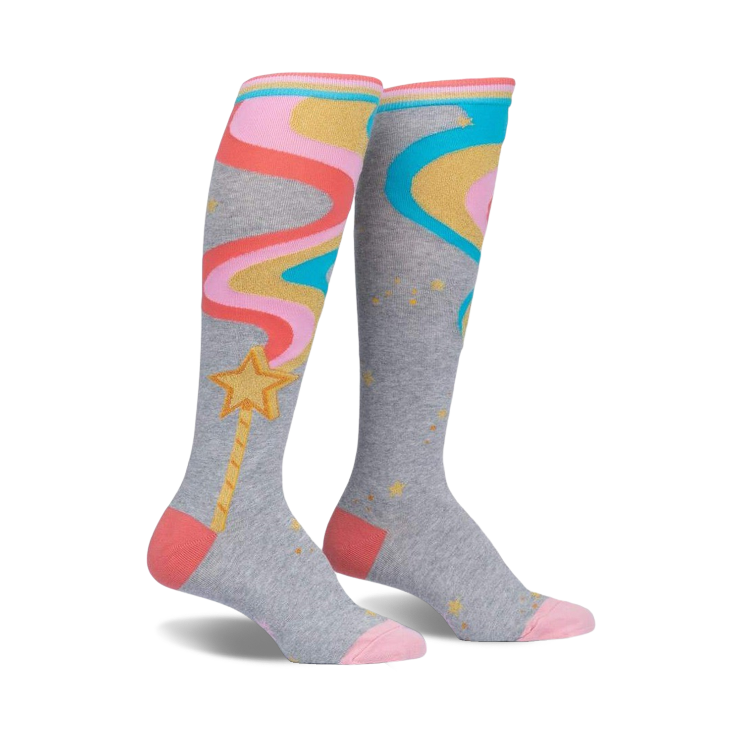 Radiate sass with these striking cosmic knee-highs. With their vibrant pink and yellow stripes, gray background adorned with twinkling stars, and a dash of rainbow magic via the shooting star motif, they'll have you strutting with celestial style. Be the shooting star in your style constellation with our It's Magic knee-highs!