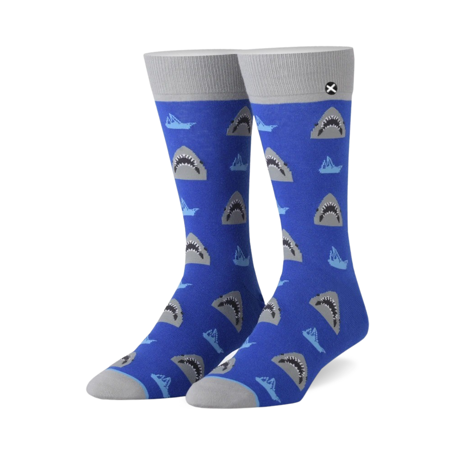 Dive into the deep blue with Jaws Amity Bay socks! These gnarly crew socks feature a school of great white sharks with pearly white teeth just waiting to take a bite. Whether you're cruising the beach or braving the office, these aquatic predators will keep your feet comfortable and stylish. Remember, the scariest monsters live in the deep waters...of your sock drawer!