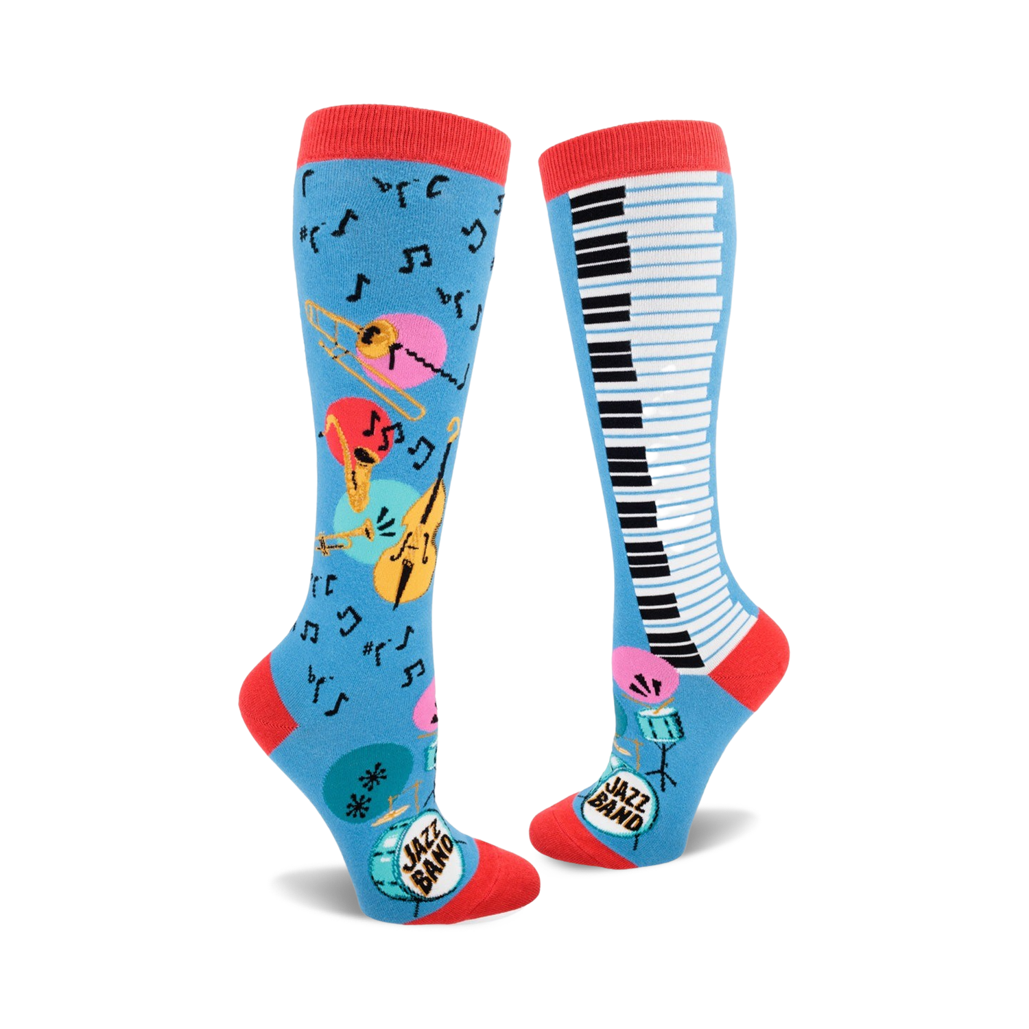 Jazz up your wardrobe with these knee-high socks for women, featuring a lively pattern of musical instruments and musical notes in blue, highlighted with red accents at the top and bottom. Perfect for any jazz enthusiast or music lover, these socks will add a touch of rhythm to your day.