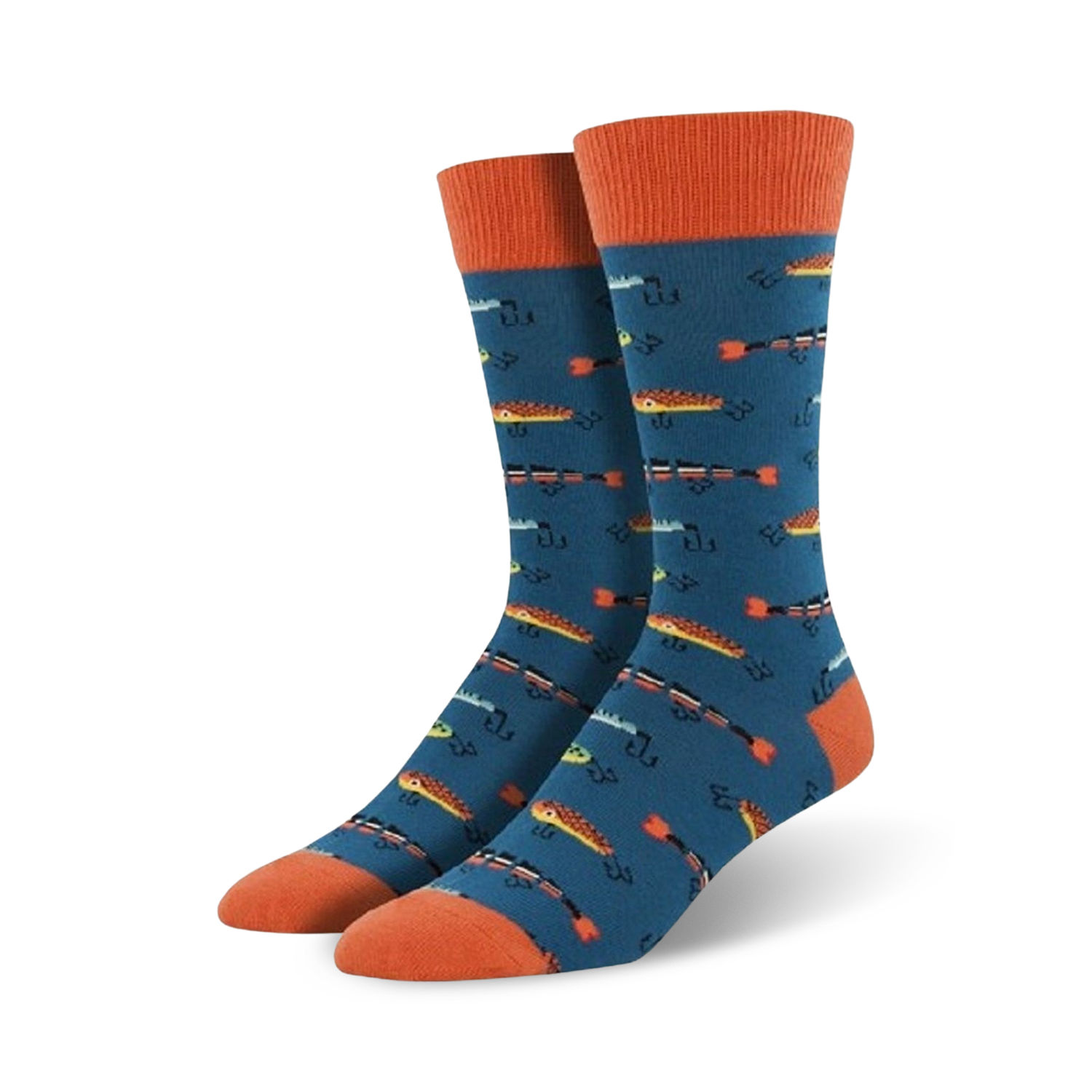 Lazy afternoons get no better than a cold drink and a day of fishing out on the open waters. These fun socks are the perfect fit for anyone with a stacked tackle box. Each cool pair of blue and orange crew socks features a print of several different fishing lures complete with hooks.