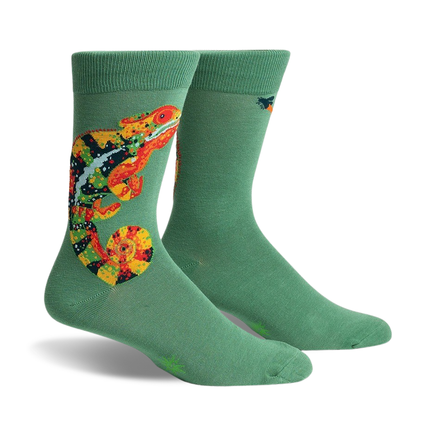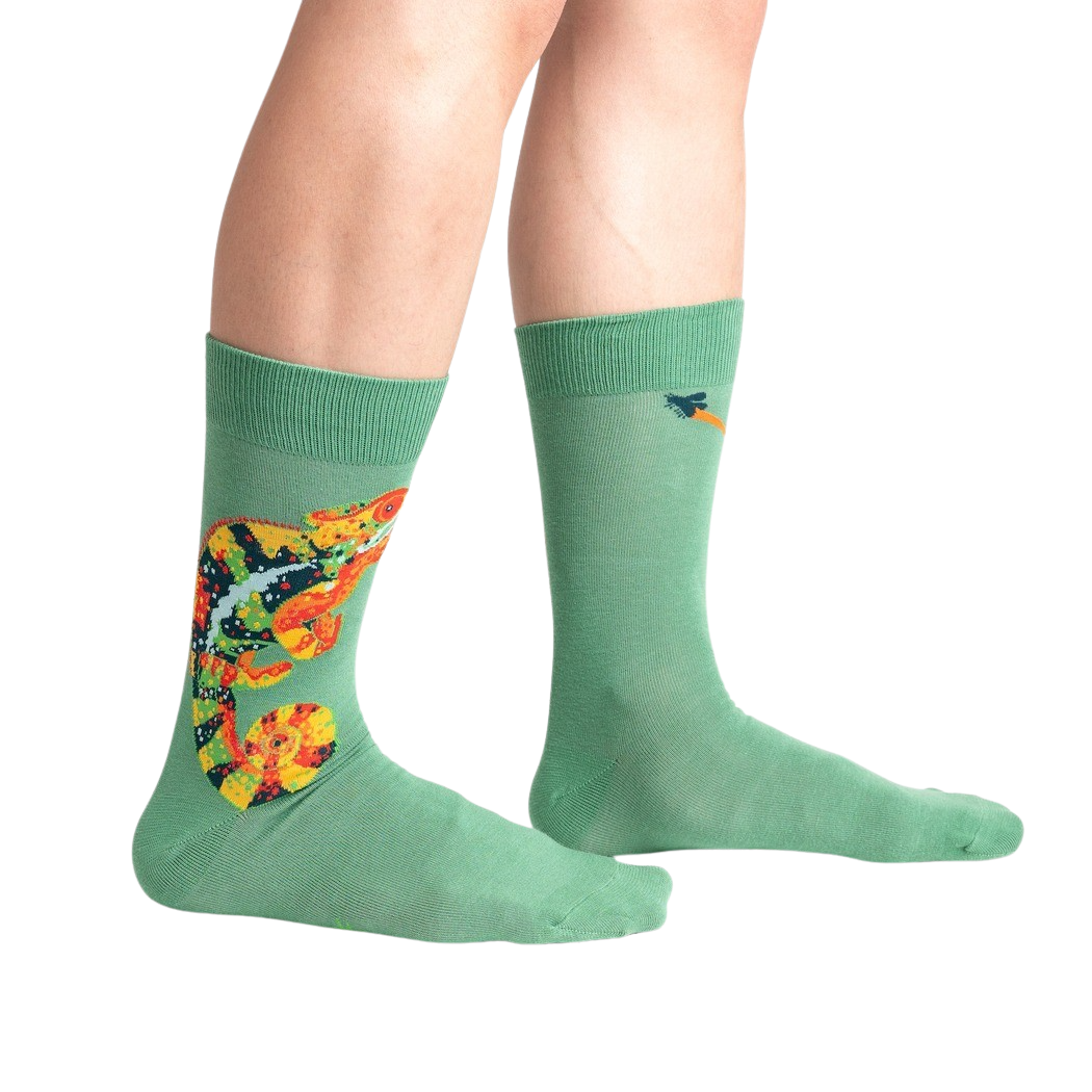 Calling all chameleon enthusiasts! These Karma Chameleon socks are as vibrant and unique as the creature they're named after. With a dark green base and a pattern of multicolored chameleons, they're impossible to miss. Plus, they're crew length, providing extra comfort and coverage for your feet. So, whether you're a fan of the 80s pop hit or just love these amazing creatures, these socks are perfect for you. Get ready to rock them and blend in with style!