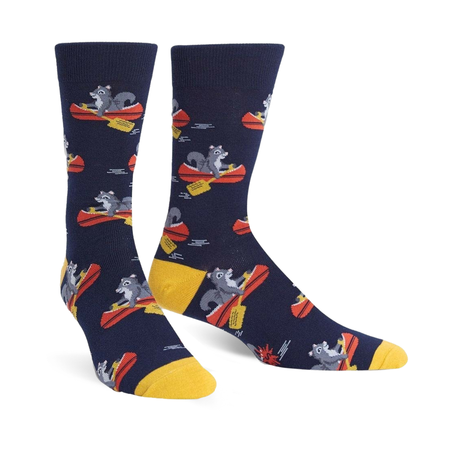 Imagine slipping into a pair of these socks and setting off on a paddling adventure with a crew of cartoon raccoons. These navy blue socks feature a pattern of red and yellow canoes filled with furry paddlers who seem determined to keep on paddling, no matter what obstacles they encounter. Perfect for anyone who loves the outdoors or just appreciates a good pun, these socks will add a touch of whimsy to any fall wardrobe.