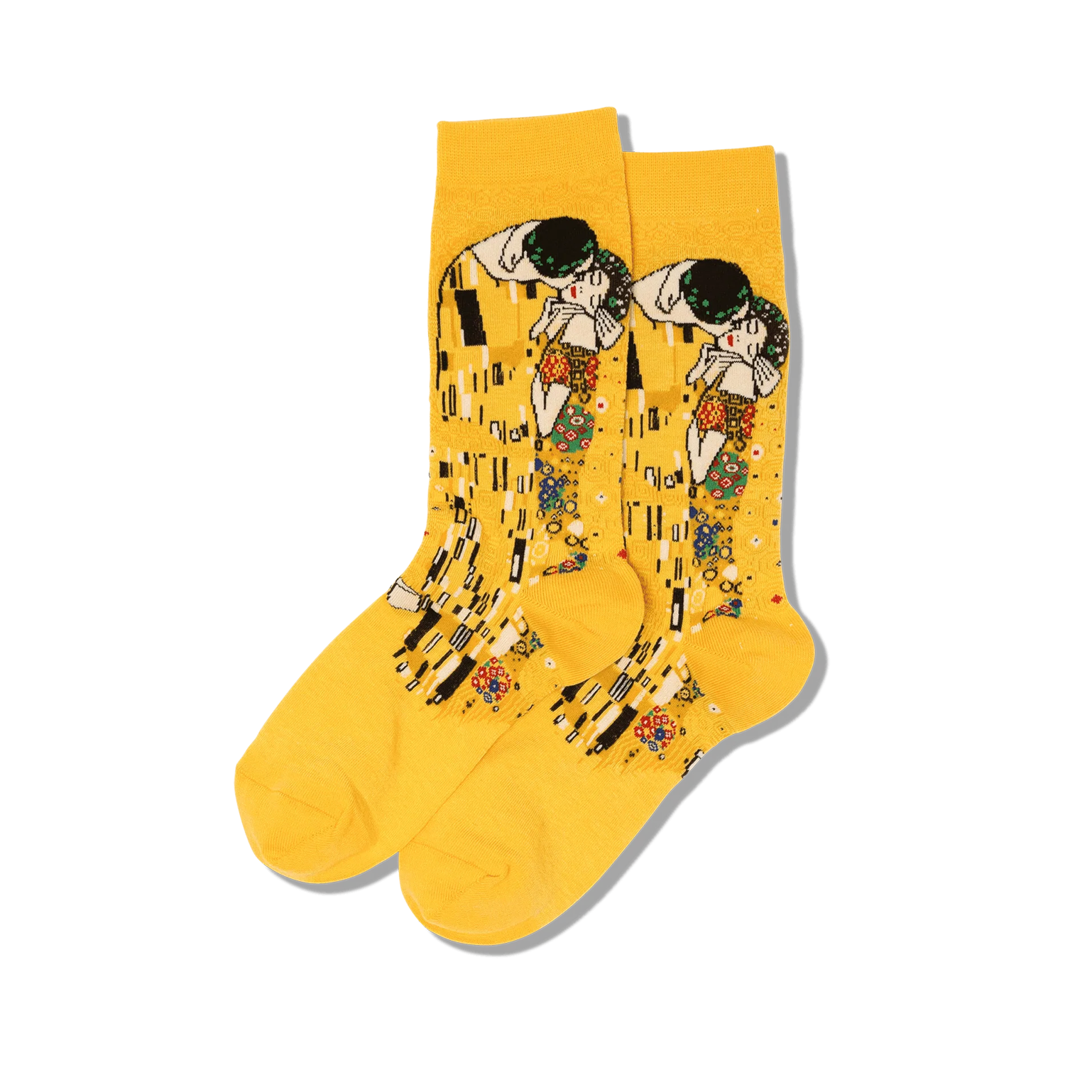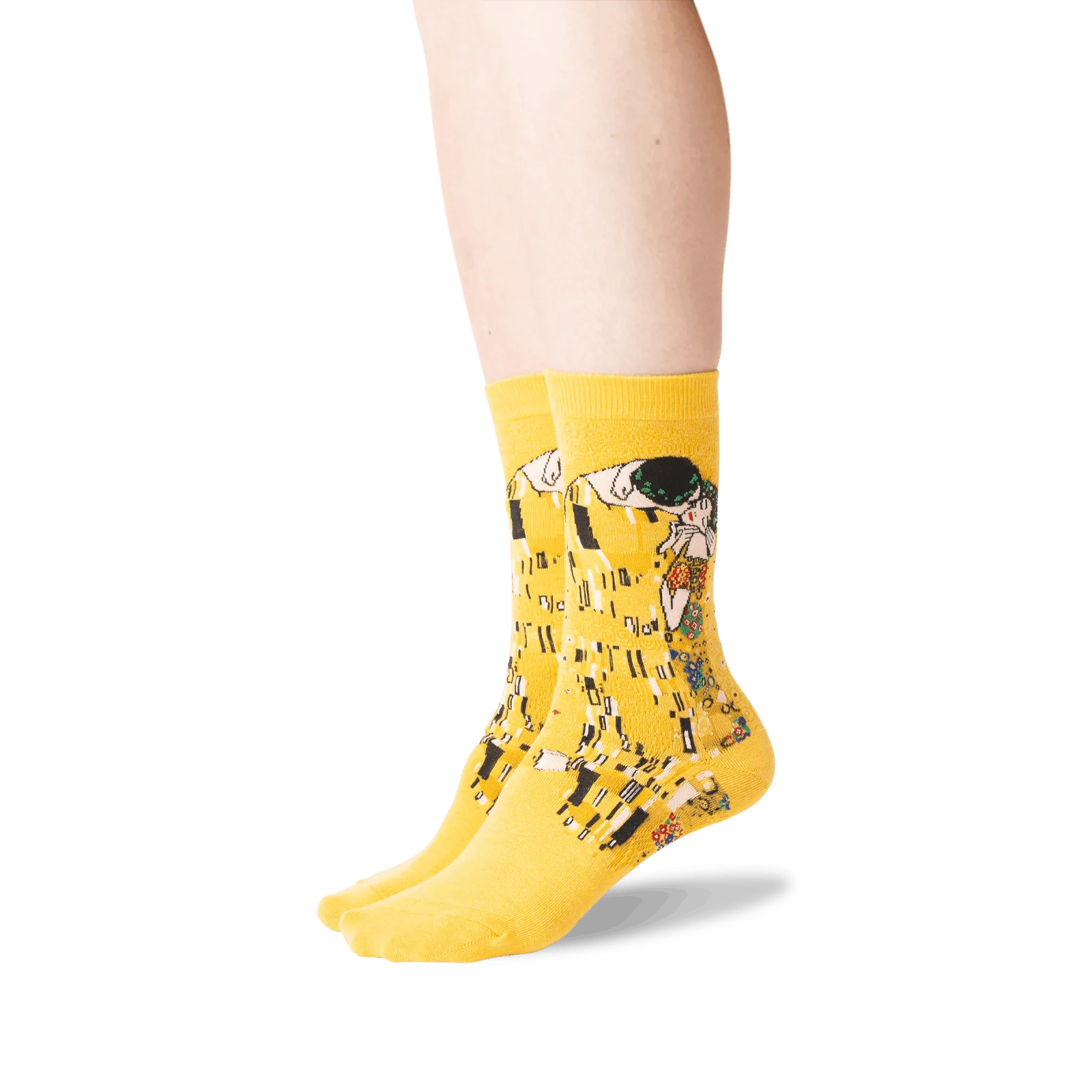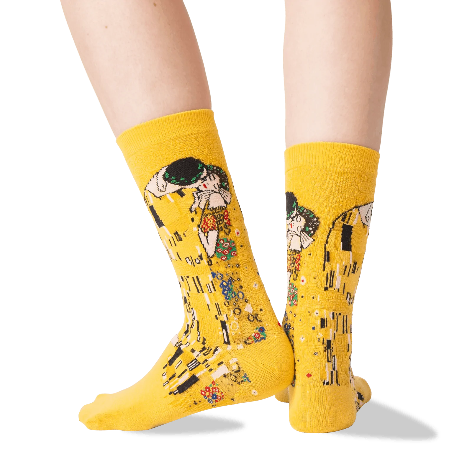 Travel back to the early 1900's and pucker up! One of Gustav Klimt's greatest oil paintings can now be yours and worn on your feet! Each cool pair of yellow crew socks features the iconic masterpiece "The Kiss". These lovely socks belong in every art lover's sock drawer!