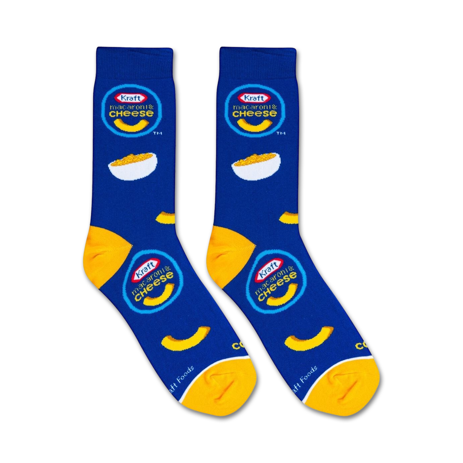 Kraft Mac & Cheese socks! The perfect gift for any mac & cheese fan. These crew-length novelty socks for men and women feature a fun pattern of Kraft Mac & Cheese boxes, including the iconic logo and picture of a steaming bowl of cheesy goodness. These funky socks will put a smile on anyone's face and inject some delicious fun into your wardrobe. Wash, wear, repeat, and enjoy your favorite comfort food on your feet!