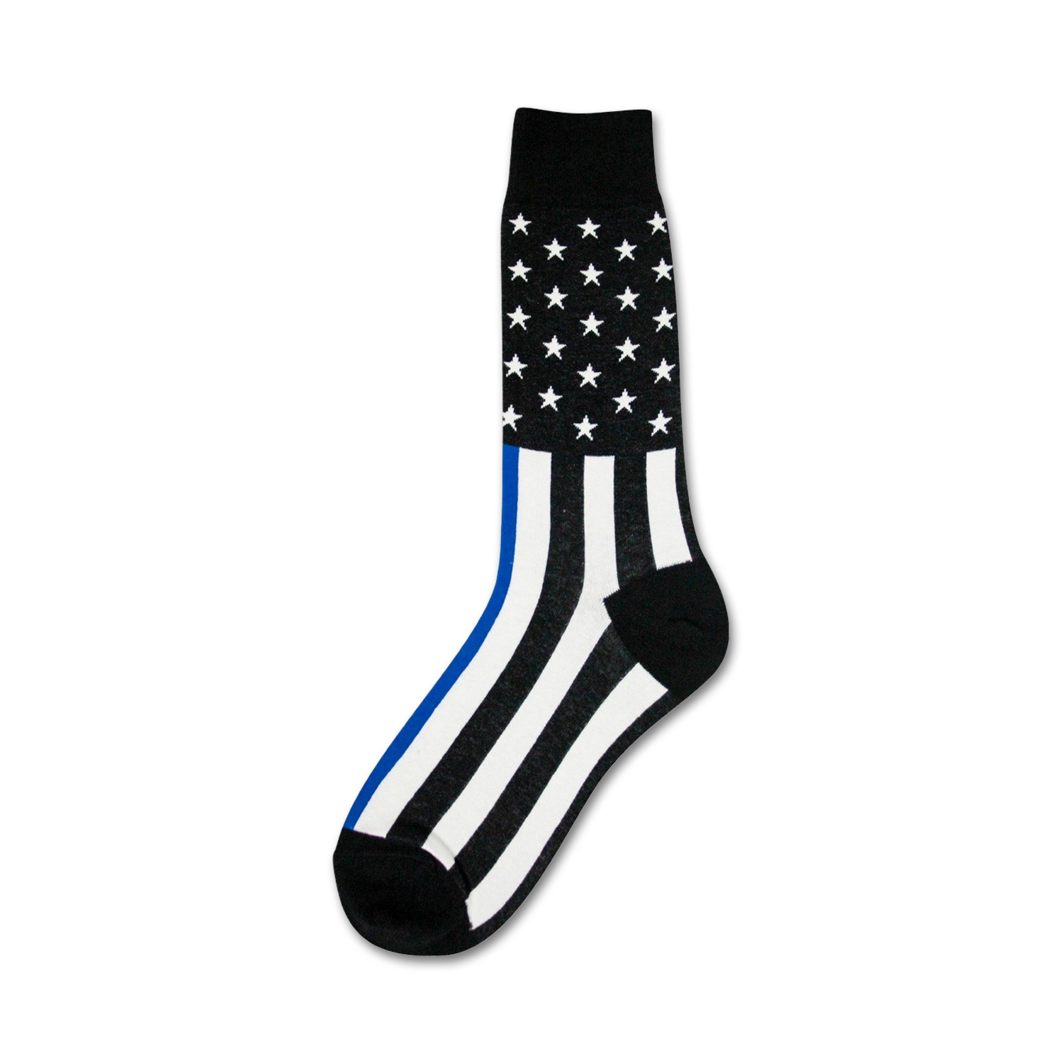 Show off your authority in these Law Enforcement crew socks! Slip your feet into these black socks and let the white stars and classic blue and white stripes do the talking. Perfect for any cop, detective, or anyone who wants to show their support for the police force. These socks are as durable as they are stylish, just like the men and women who wear the badge.