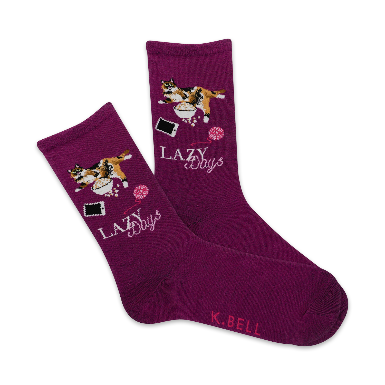 These Lazy Days socks are purrfect for any cat lover. Featuring a pink bowtie wearing kitty cat lounging on a soft pink pillow with a ball of yarn and pink telephone nearby, these crew socks will have you feeling relaxed and cozy. So put your paws up and enjoy some lazy days in style.