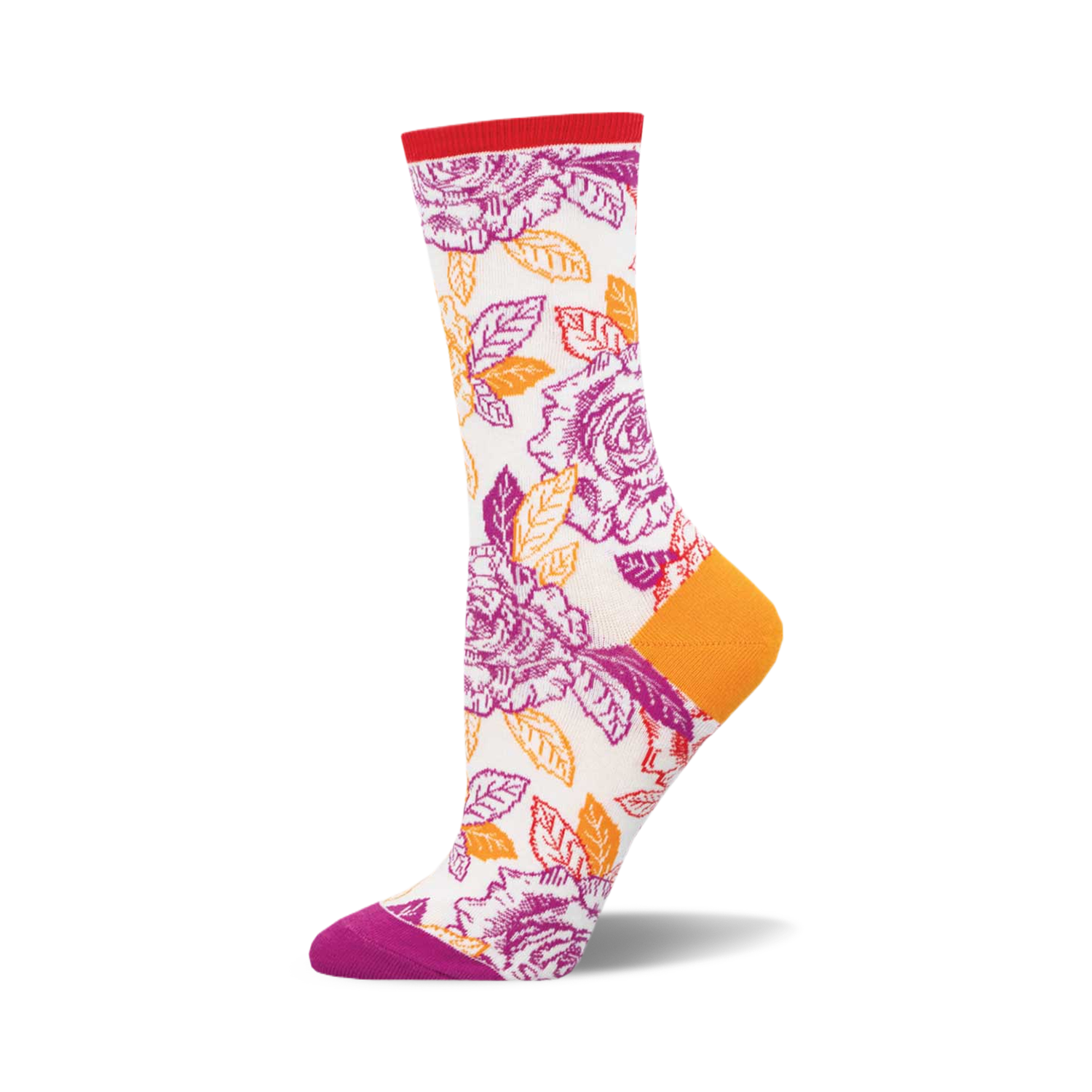 Brighten your sock drawer with a touch of sassy charm! Our Lesbian Roses novelty socks burst with a lively pattern of orange and purple roses against a crisp off-white background, punctuated by a bold red cuff and playful purple accents on the toes and heels. Perfect for festivals, casual brunches, or just lounging around, these crew-length socks add a flair of fun to any outfit. Ready to blossom in your footwear collection, why not let your feet show off their petal power?