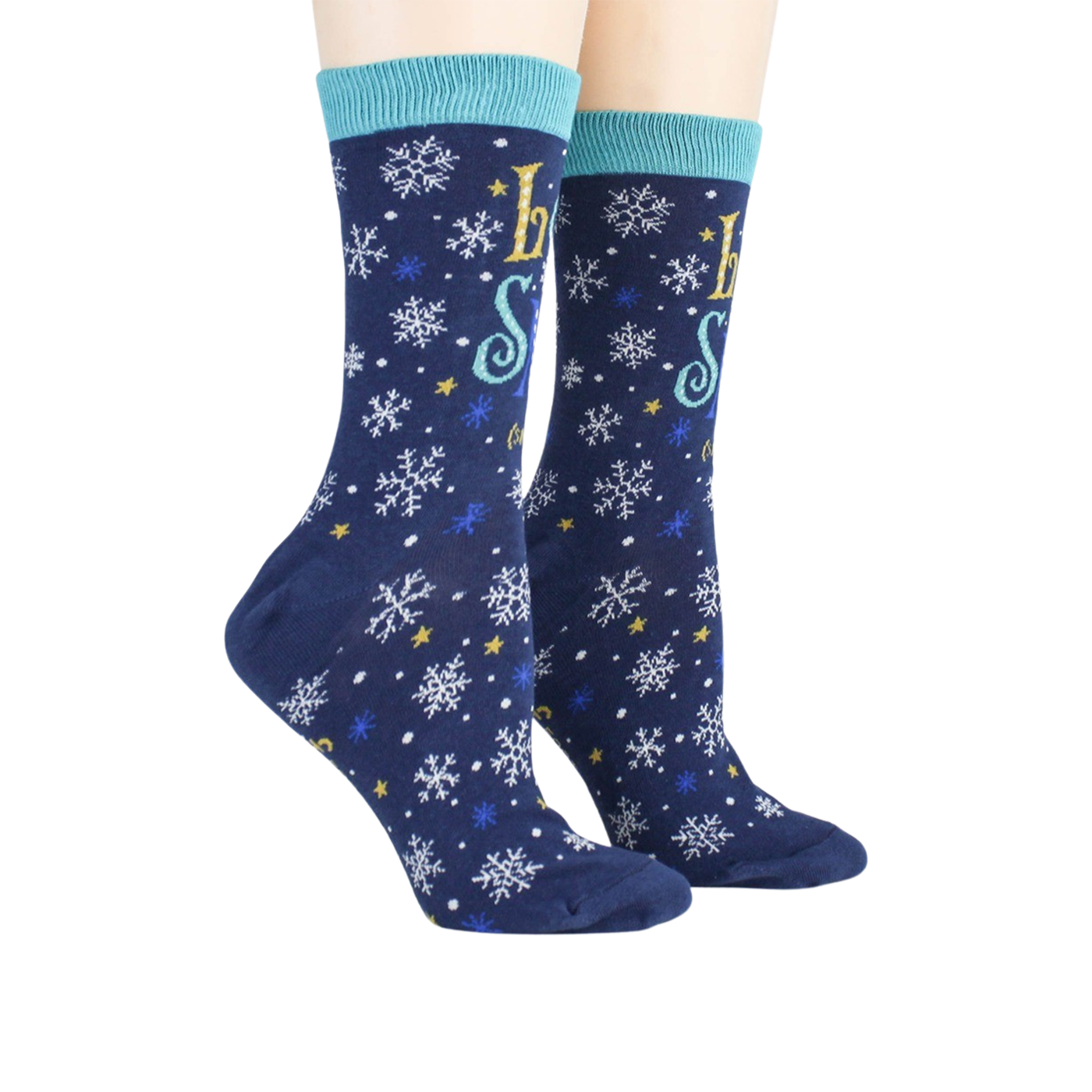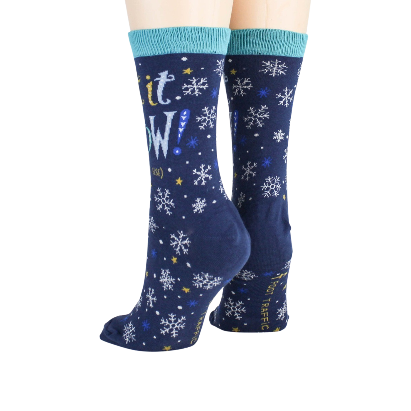 Let It Snow...Somewhere Else. Embrace the winter blues with these icy blue crew socks adorned with snowflakes and the phrase "Let it Snow!" in golden script. But wait, there's a twist! Below, you'll find the hilarious addition "Somewhere Else." Perfect for those who love the holiday spirit but prefer to stay cozy indoors, these socks will make your feet feel as jolly as Santa's elves while keeping the snow where it belongs - outside!
