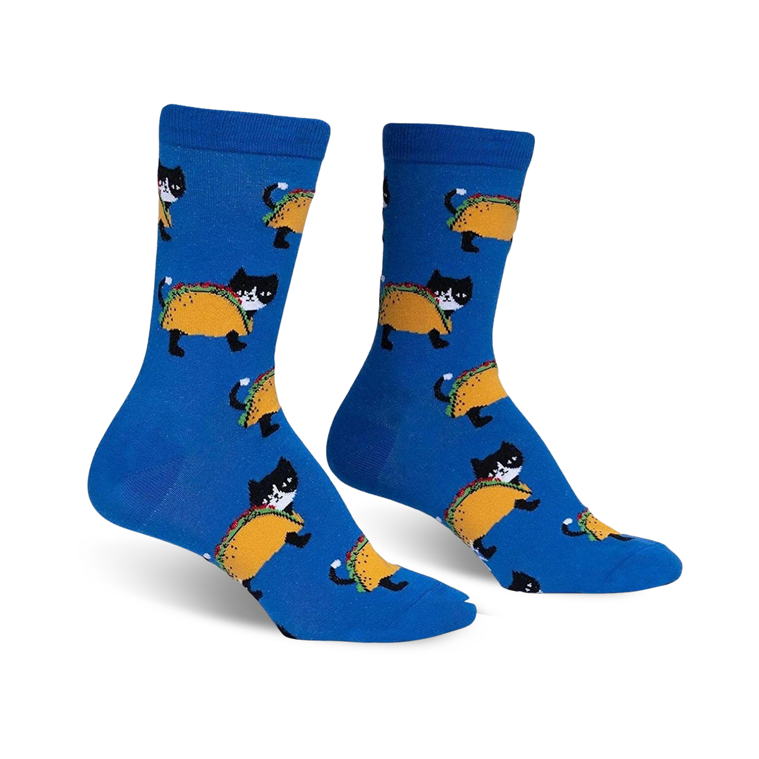 Strolling around with your head in the proverbial tacos while kitties are lounging in them will be as easy as pie when you sport these "Let's Taco 'bout Cats" novelty crew-length women's socks. You'll be having a ball as you trip the light fantastic and make a splash among your acquaintances. What are you waiting for? Don't let your paws be without these purr-fect taco treats!