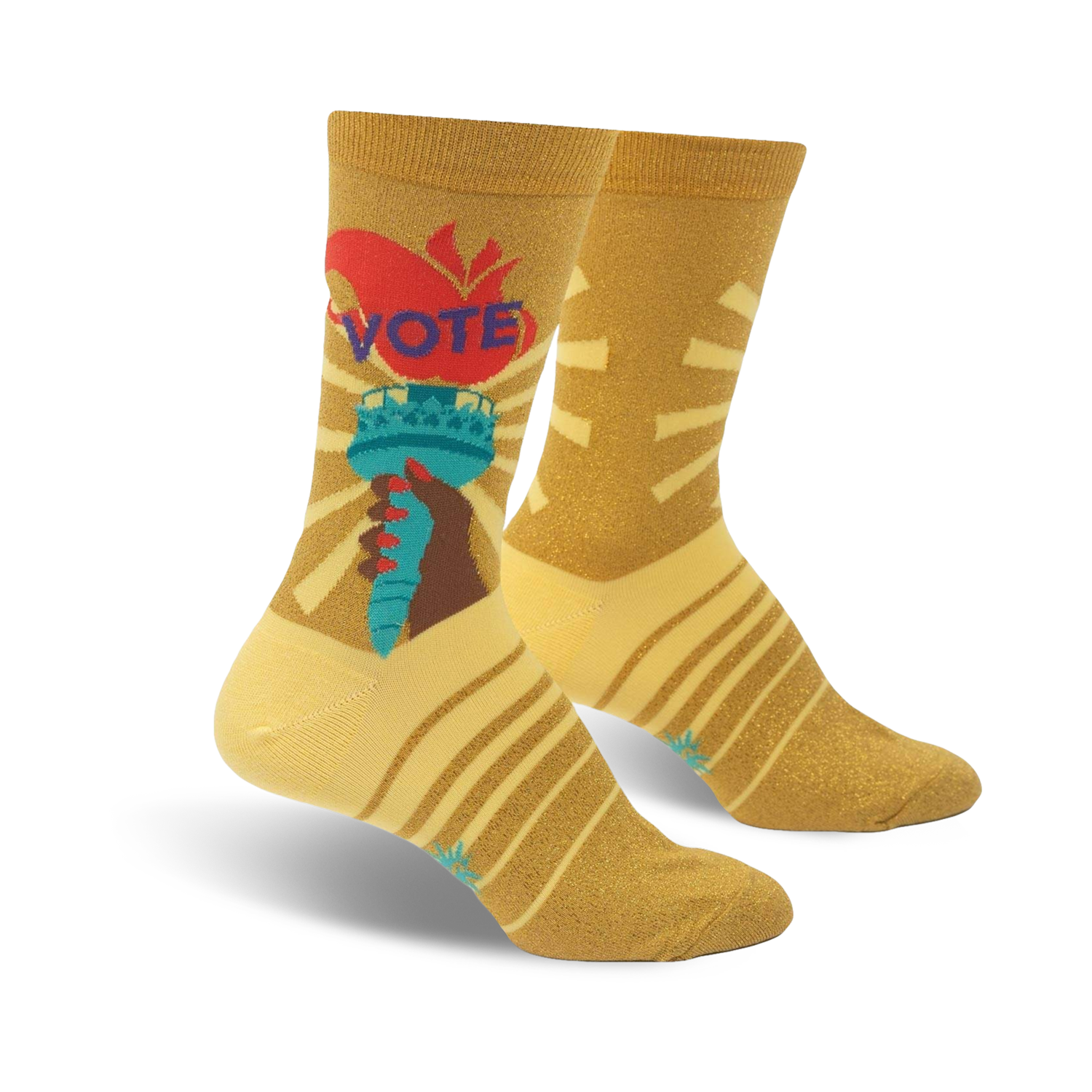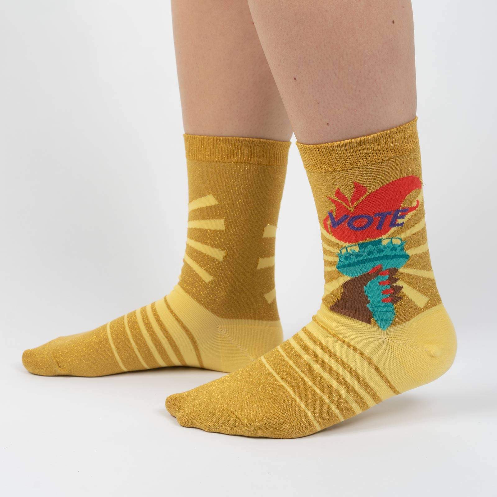 Vote like Lady Liberty in these patriotic socks that are as bold as the torch she holds high! With bright yellow and black stripes, these crew length socks let the world know your voice matters. These womens socks combine fashion and politics to make a statement at the polls!