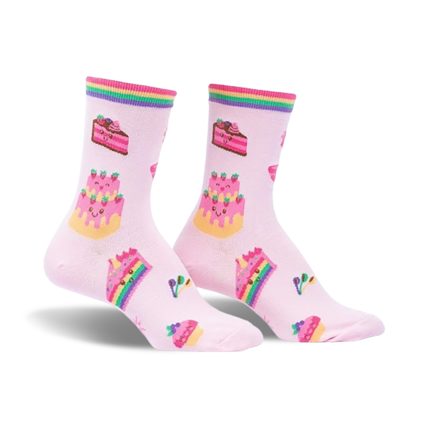 Life Is Batter With Cake! No, really! Our women's cotton socks are pink and feature an adorable pattern of cartoon cakes, cupcakes, and rainbows. Get ready to add a sweet treat to your feet and brighten up your day. Remember, life is always batter with cake - and a great pair of socks ;)