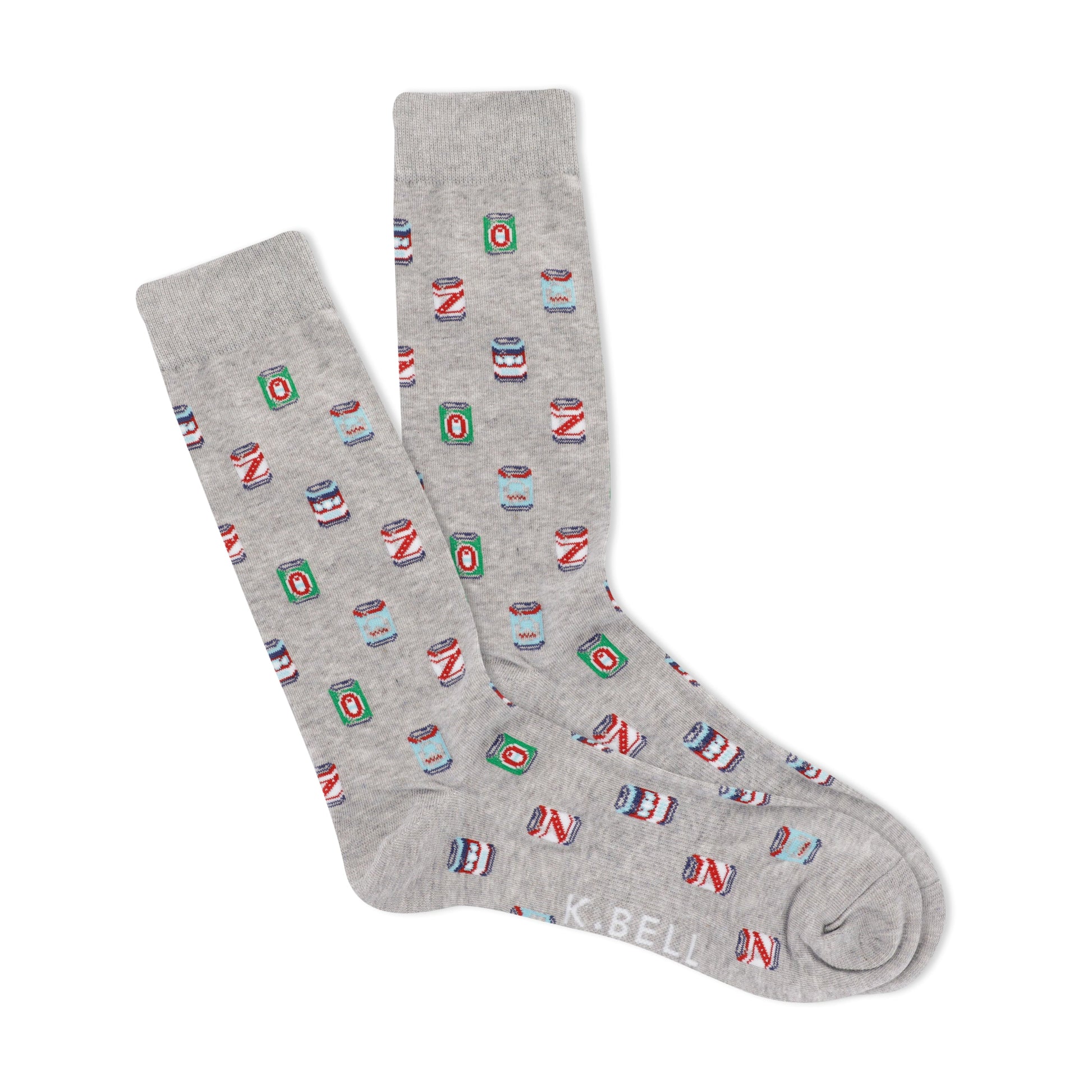 These 'Little Beer Cans' socks are a fun twist on a classic. They're a heather gray with a repeating pattern of small, colorful beer can illustrations. The cans are shown in various colors- reds, greens, and blues are visible- and some have text on them, though it's too small to read. The socks themselves are crew socks, and the visible part of the sole is also gray. The brand's name is visible near the heel.