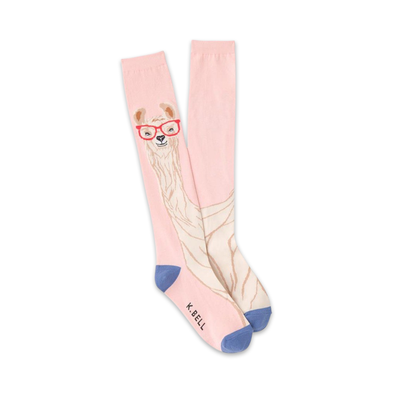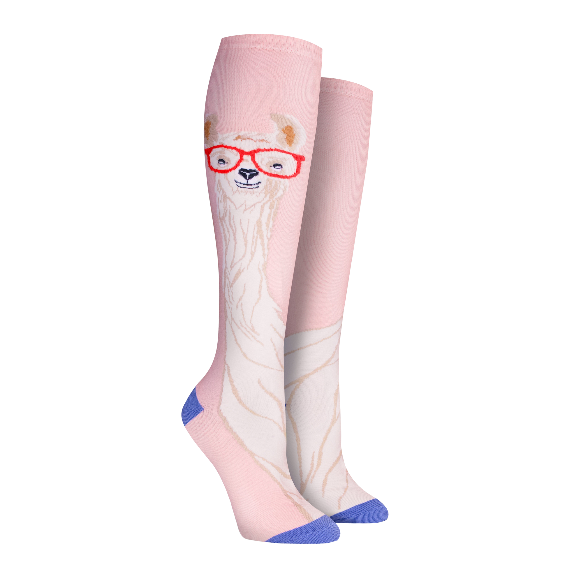 **Llama With Glasses Socks**: Brighten up your day with these knee-high cotton socks featuring a pattern of adorable brown and white llamas wearing red glasses. These fun llama socks bring a quirky touch to any outfit and make a great gift for animal lovers.