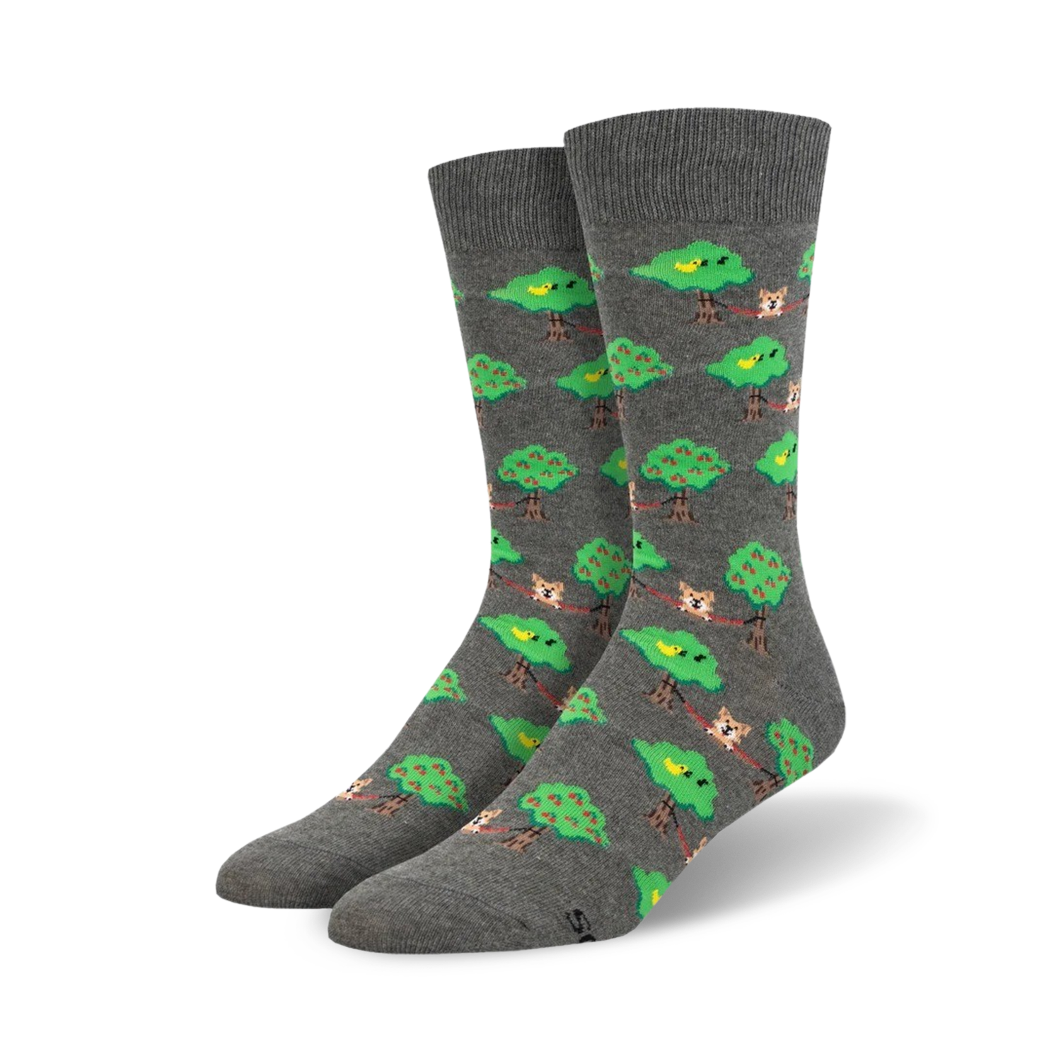 Dog lovers, get ready to take your sock game to the next level with our "Lounge Dogs" crew socks! Picture this: gray socks adorned with a hilarious pattern of cartoon dogs chilling in trees, sporting cool sunglasses. These canine companions are living the good life, lounging amidst vibrant green leaves and red apples. They're a perfect reminder that sometimes, the best thing to do is kick back and relax. Plus, you'll be the talk of the town with these unique socks that are sure to get a chuckle from anyone who sees them.