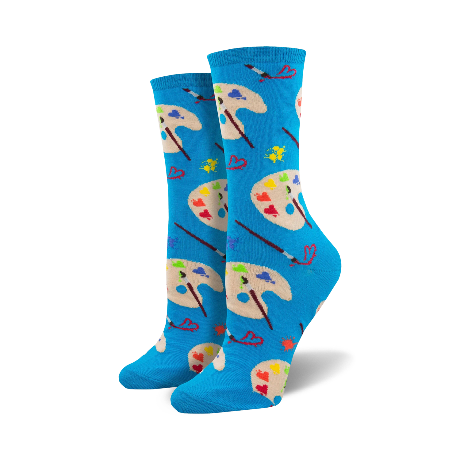 Paint your feet into a masterpiece with our Lovely Art socks! These crew length socks for women are a canvas of creativity, featuring a colorful pattern of paint palettes, paintbrushes, hearts, and paint splatters. Let your feet be a walking art exhibit wherever you go. Put on a pair of Lovely Art socks and step into the spotlight as your feet become a canvas of expression.