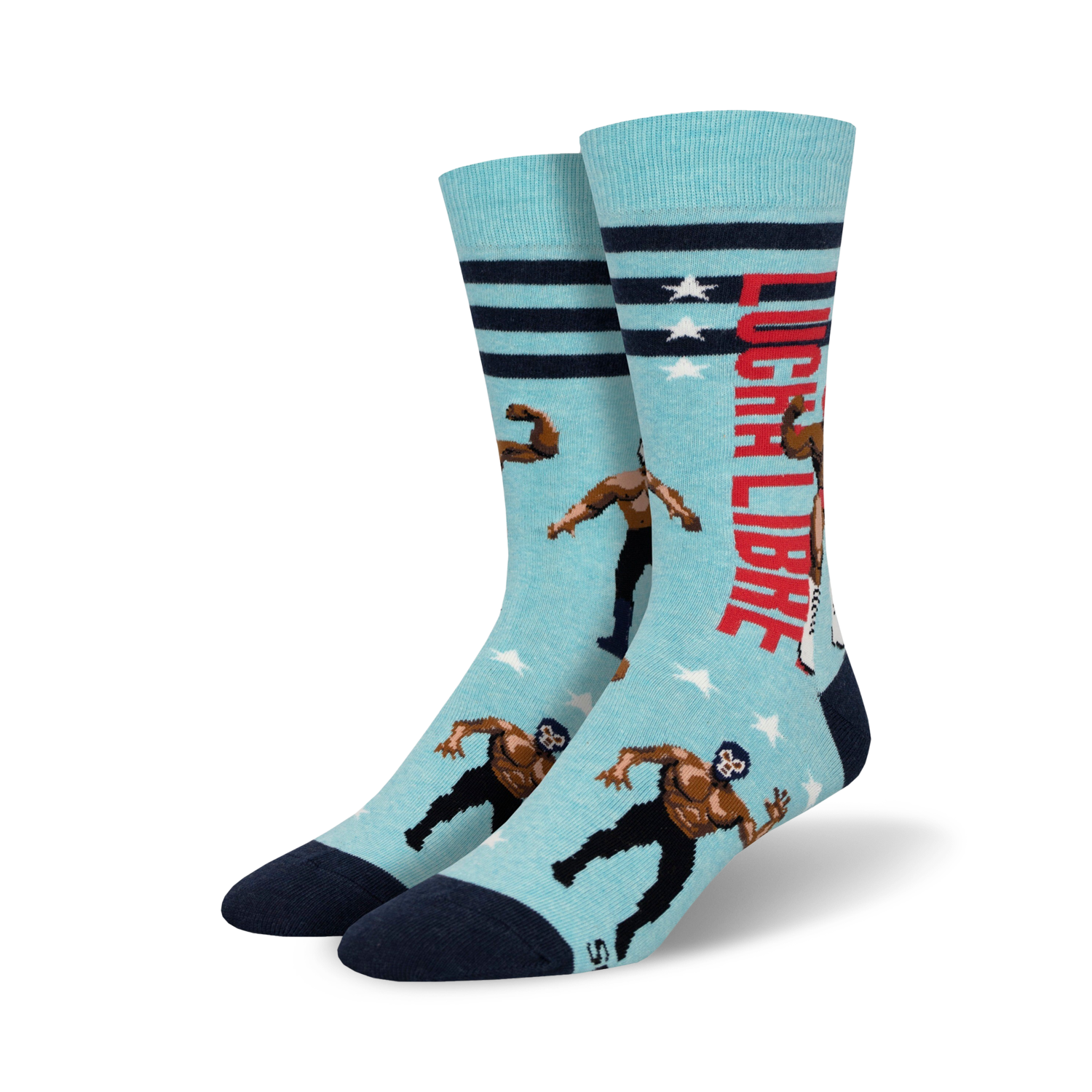 Prepare for a sock-tacular showdown with our Lucha Libre Crew Socks! These light blue socks feature a ringside view of luchadores, the masked Mexican wrestlers, battling it out in vibrant red and blue masks. Step into the ring of fashion with these fun and energetic socks, perfect for any fan of wrestling, lucha libre, or just plain fun. Whether you're cheering on your favorite luchador or just adding some flair to your sock game, these socks are sure to be a knockout!