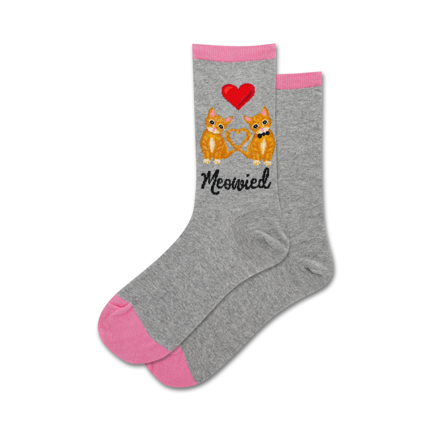Check out these 'Meowied' socks! They're light blue with a beige cuff, showing two adorable orange kitties intertwined in a heart shape. A red heart and the word 'Meowied' are also visible. Super cute and perfect for cat lovers or anyone celebrating a wedding. The design is simple but really sweet. Another pair shown is gray with a pink cuff, featuring the same charming cat design and wording.