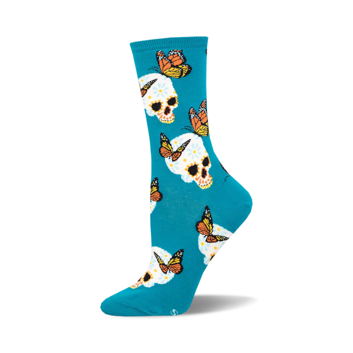 Tiptoe into the unexpected with our "Metamorphosis" crew socks. Cloaked in a deep blue, these aren’t just any foot coverings. They're a clash of the macabre and the magnificent, where skulls whisper secrets among vibrant blooms and monarch butterflies flutter in defiance of the mundane. It’s not just about keeping your toes warm—it’s about making a statement that’s as bold as it is beautiful. Perfect for those who wear their quirks on their sleeves, or in this case, on their feet. Dive feet first into a world where every step is a story.
