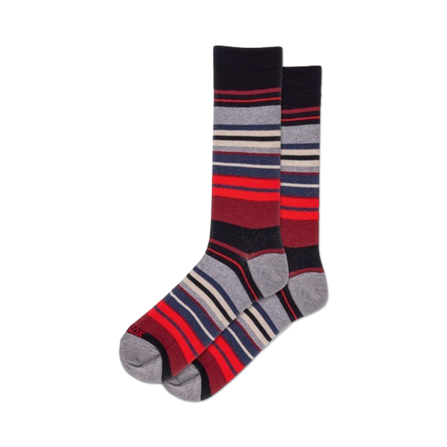 Got a case of the stripe bug? You bet! Our Mixed Stripe socks for men have seven stripes in total: black, red, gray, blue, white, and two burgundy stripes. You won't find a sock that has more stripes than this! Perfect for the fashionista who dares to add a dash of color and personality to their attire. Plus, you can flaunt stripes any day of the week!