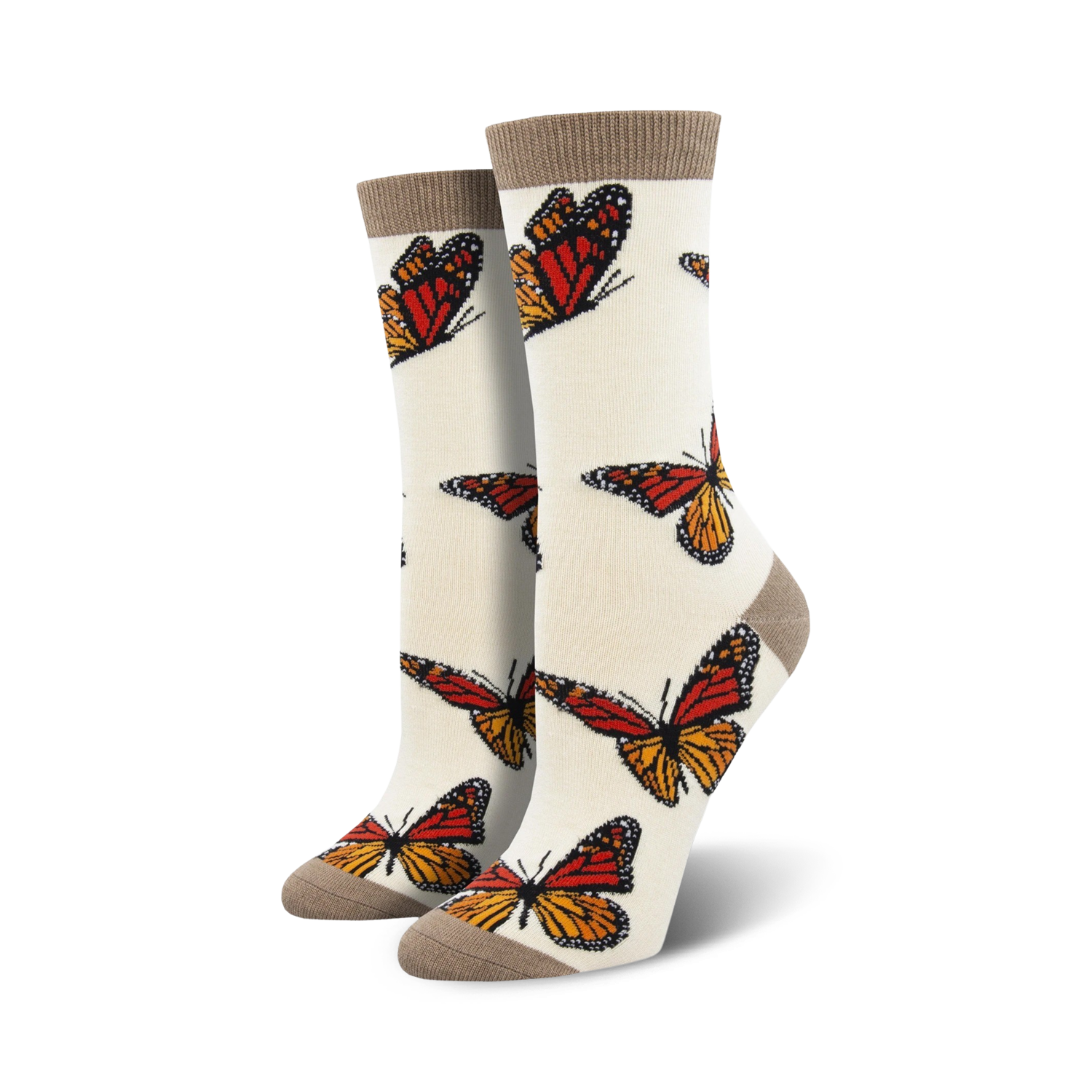 Fly with the Monarchy! These crew socks for women feature a whimsical parade of orange and black butterflies highlighted by white markings. Delicate and stunning, these socks are a fluttery fashion statement that will brighten your day. Fun fact: butterflies can taste with their feet.