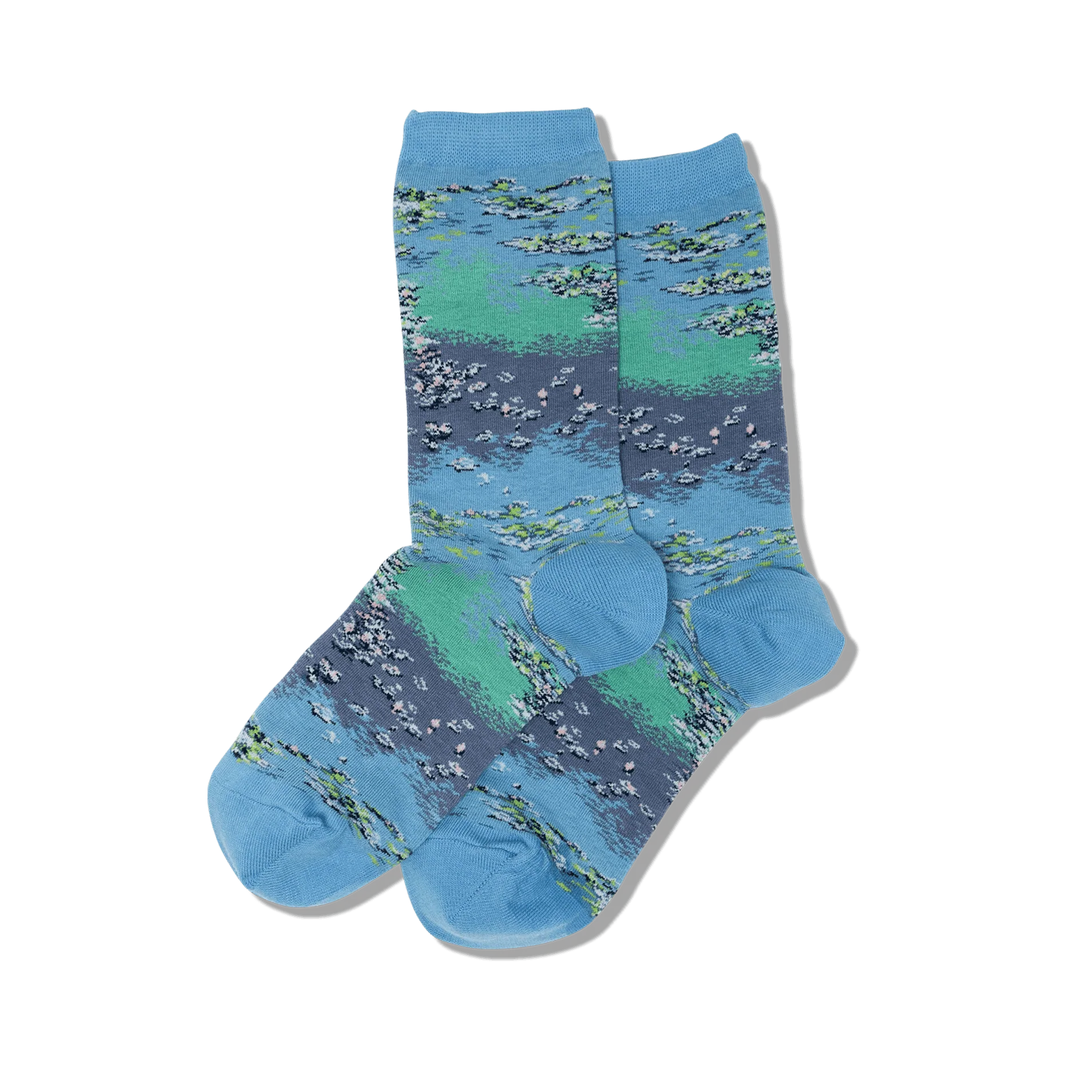 Claude Monet is known for his amazing and captivating oil paintings that captured the essence of nature. The painting "Water Lilies" is no exception and now you don't have to go to a museum to view it! Each cool pair of crew socks features the amazing artwork of Claude Monet's masterpience in a vibrant display.