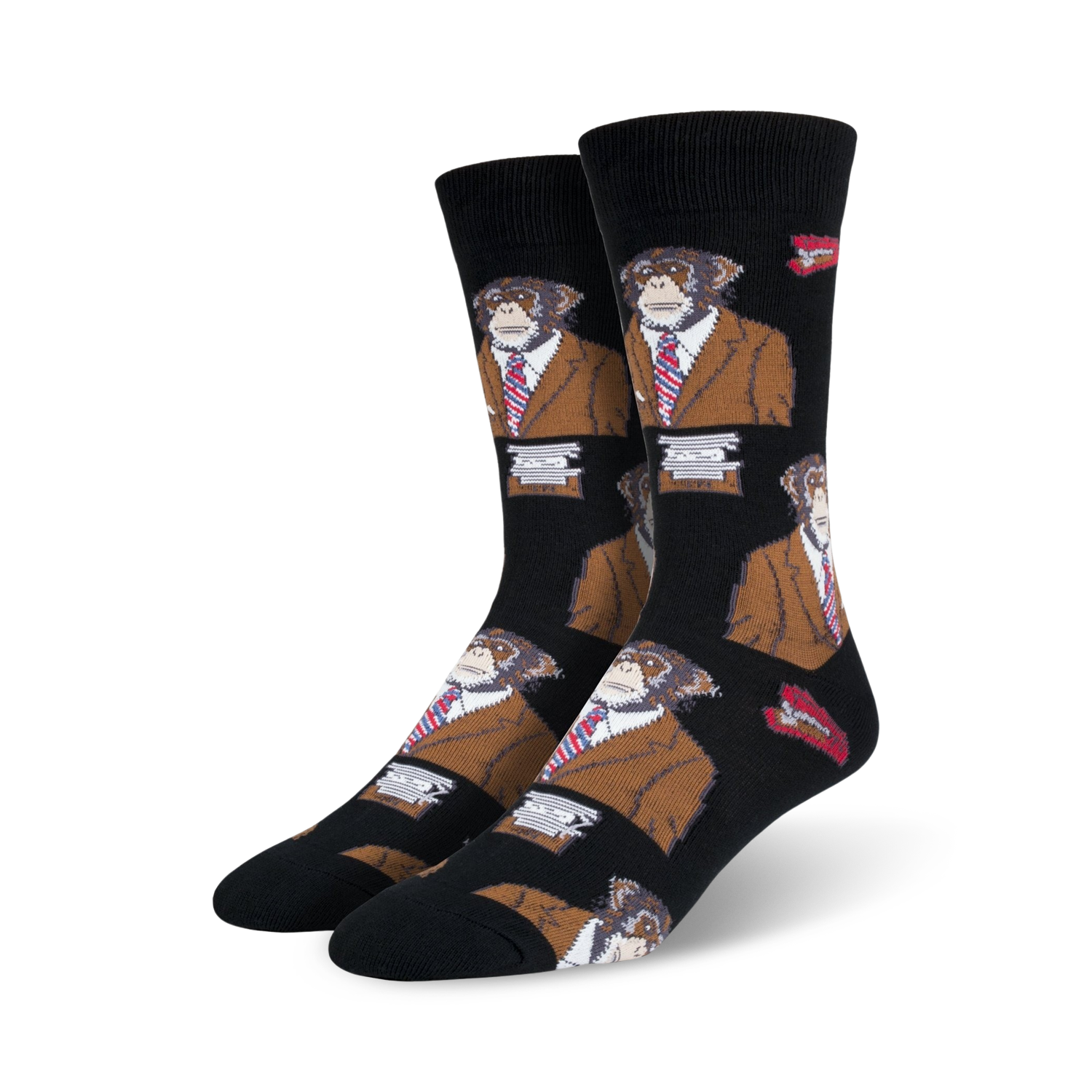 Monkey Biz Socks: Monkeying Around in Style! Step into Monkey Biz socks and let the good times roll! These black crew socks for men feature an irresistible pattern of serious monkeys dressed in suits and ties, carrying briefcases. Picture this: monkeys in the boardroom, taking care of monkey business! The fun doesn't stop there - these socks are made with the highest quality materials for extra comfort while keeping up with yourmonkey lifestyle. The Monkey Biz socks are guaranteed to bring a smile to your face and those around you. Get your Monkey Biz socks today and monkey around in style!