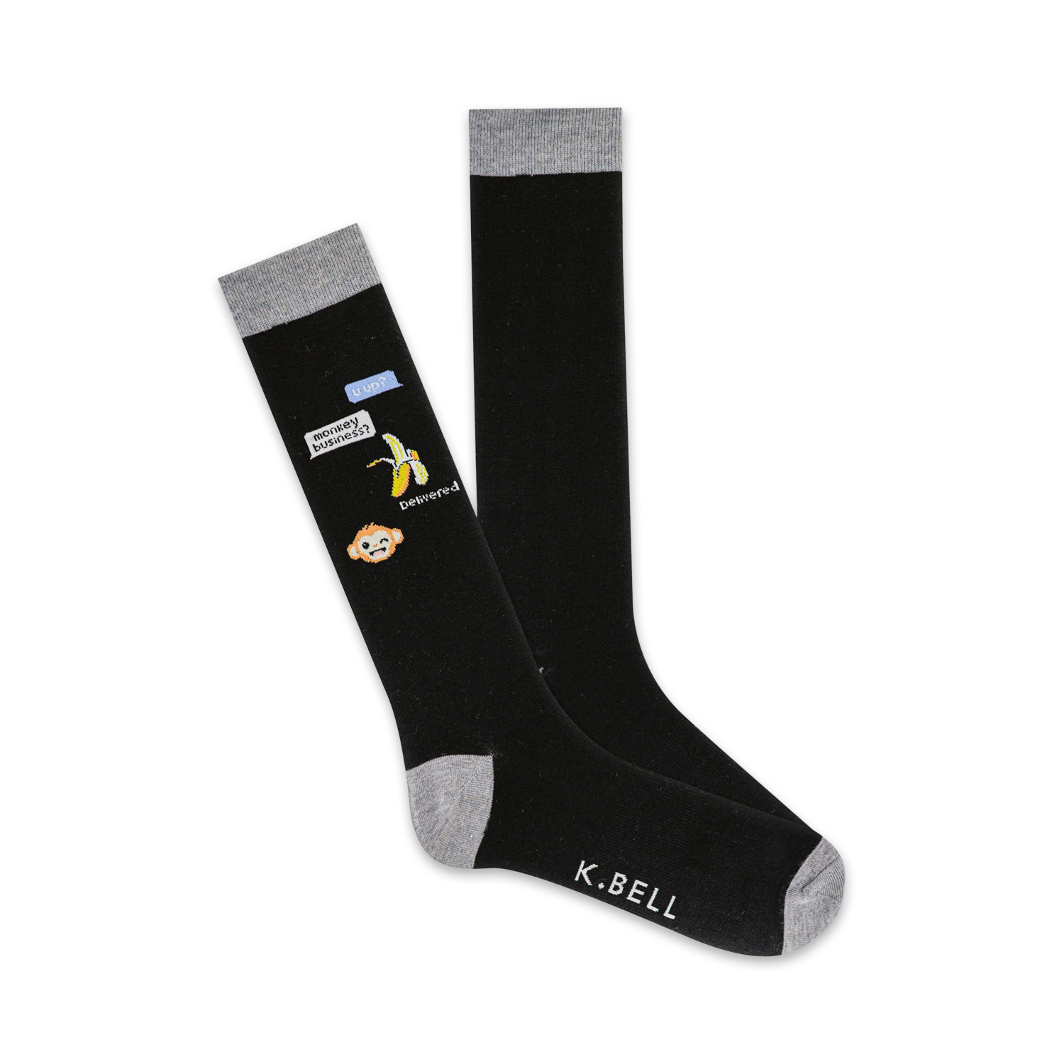 Get ready to monkey around with our Monkey Business Text Socks! These crazy crew socks feature a cheeky monkey holding a banana and sending texts on his phone. The black socks with gray toes, heels, and cuffs add a touch of sophistication to this silly design. Perfect for men with a sassy side, these socks will have you laughing at the text bubble that says "monkey business?"