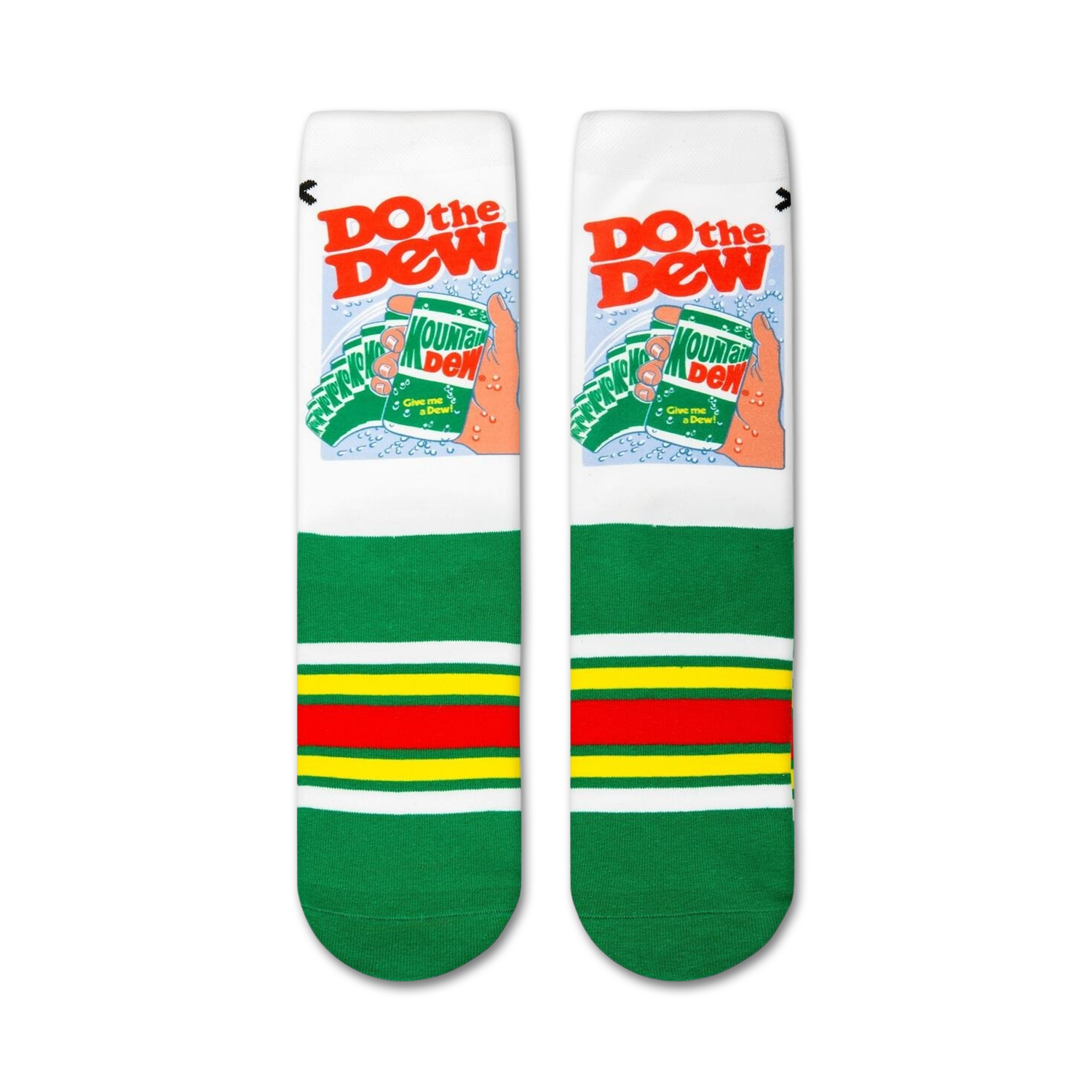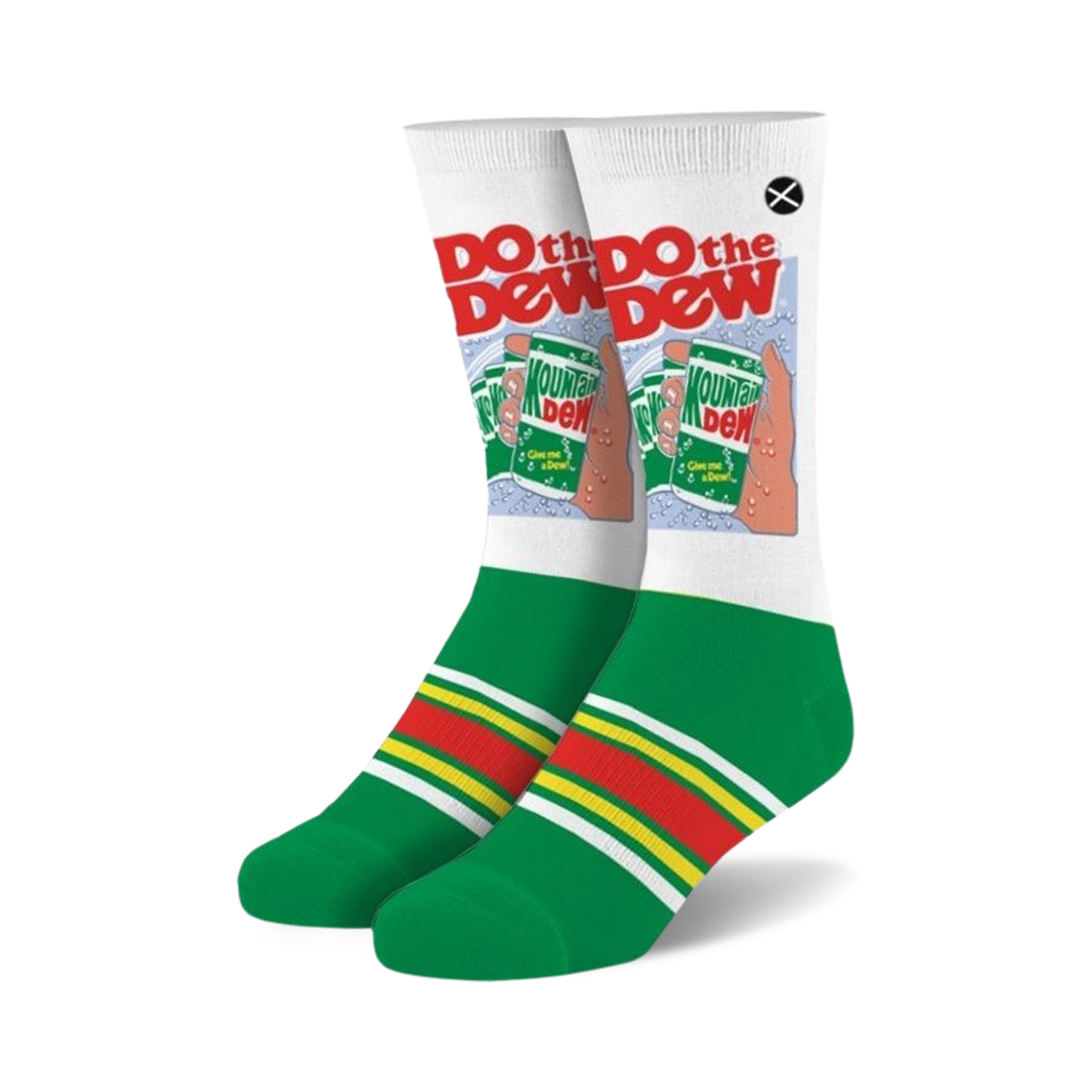 Mountain Dew Do The Dew Socks: The socks to quench your thirst for adventure. These crew socks are Mountain Dew-licious! With green and red stripes at the top and a green heel and toe, they're sure to quench your thirst for style. The main part of the sock is white with an image of a hand holding a can of the legendary soda. Wear them any day, any time, but especially when you're craving a cool, refreshing Mountain Dew. Take a sip of fun and slip into a pair of Mountain Dew socks today.